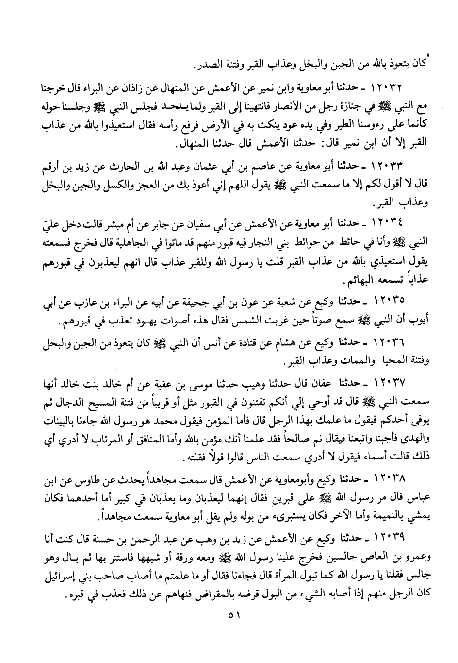 12034 - حَدَّثَنَا أَبُو مُعَاوِيَةَ، عَنِ الْأَعْمَشِ، عَنْ أَبِي سُفْيَانَ، عَنْ جَابِرٍ، عَنْ أُمِّ مُبَشِّرٍ، قَالَتْ: دَخَلَ عَلَيَّ النَّبِيُّ صَلَّى اللهُ عَلَيْهِ وَسَلَّمَ وَأَنَا فِي حَائِطٍ مِنْ حَوَائِطِ بَنِي النَّجَّارِ، فِيهِ قُبُورٌ مِنْهُمْ، قَدْ مَاتُوا فِي الْجَاهِلِيَّةِ، قَالَ: فَخَرَجَ فَسَمِعْتُهُ، يَقُولُ: «أَسْتَعِيذُ بِاللَّهِ مِنْ عَذَابِ الْقَبْرِ» قُلْتُ: يَا رَسُولَ اللَّهِ §وَلِلْقَبْرِ عَذَابٌ؟ قَالَ: «إِنَّهُمْ لَيُعَذَّبُونَ فِي قُبُورِهِمْ عَذَابًا تَسْمَعُهُ الْبَهَائِمُ»