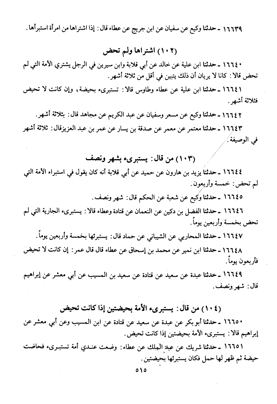 16647 - الْمُحَارِبِيُّ، عَنِ الشَّيْبَانِيِّ، عَنْ حَمَّادٍ، قَالَ: «§يَسْتَبْرِئُهَا بِخَمْسَةٍ وَأَرْبَعِينَ يَوْمًا»
