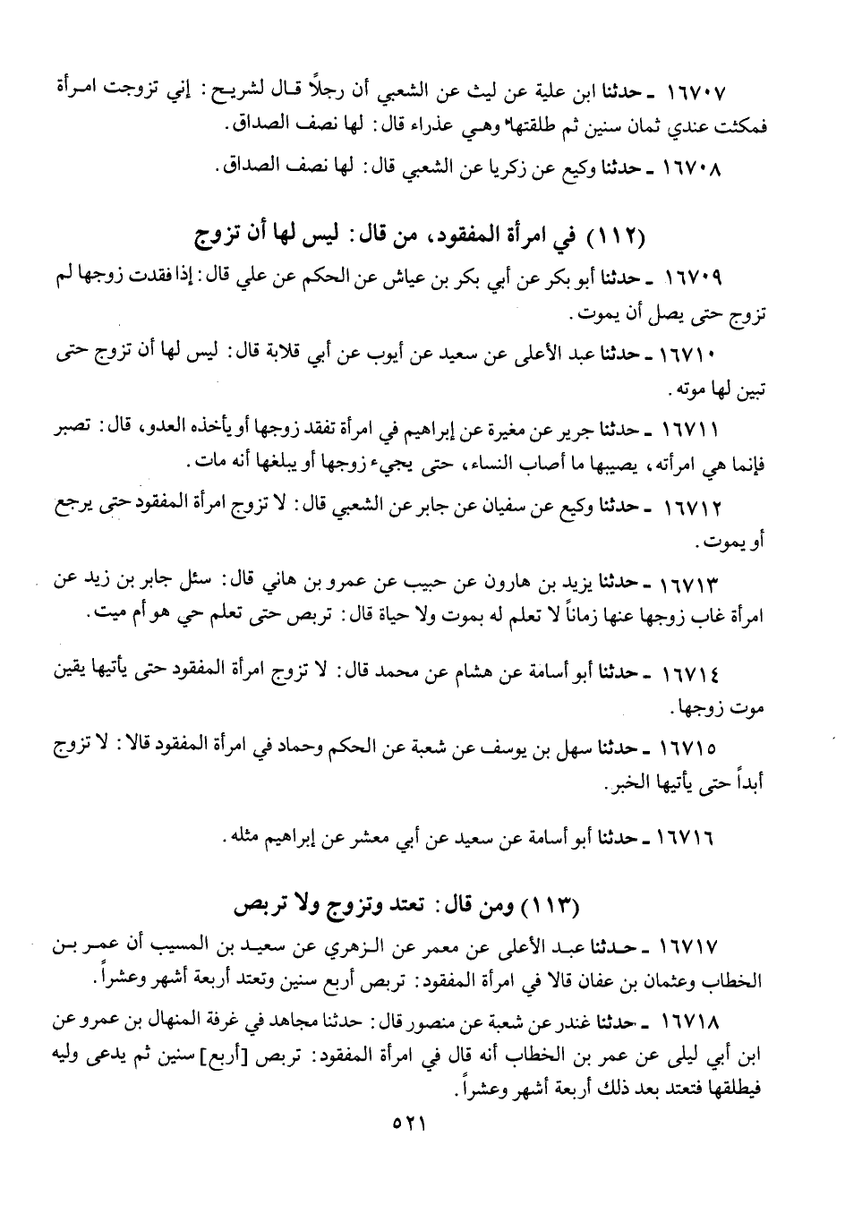 16712 - وَكِيعٌ، عَنْ سُفْيَانَ، عَنْ جَابِرٍ، عَنِ الشَّعْبِيِّ، قَالَ: «§لَا تُزَوَّجُ امْرَأَةُ الْمَفْقُودِ، حَتَّى يَرْجِعَ أَوْ يَمُوتَ»