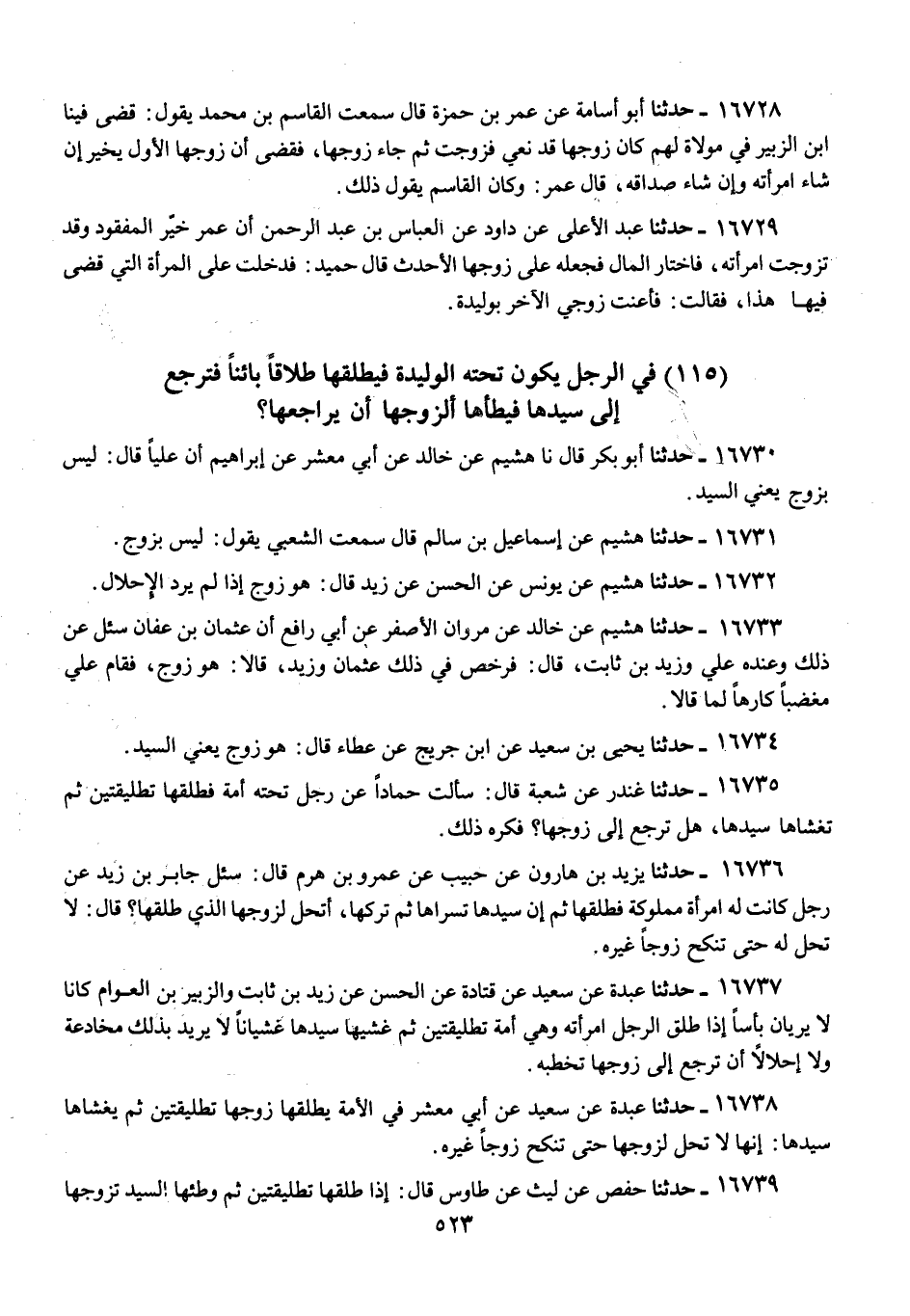 16736 - يَزِيدُ بْنُ هَارُونَ، عَنْ حَبِيبٍ، عَنْ عَمْرِو بْنِ هَرِمٍ، قَالَ: سُئِلَ جَابِرُ بْنُ زَيْدٍ، عَنْ §رَجُلٍ كَانَتْ لَهُ امْرَأَةٌ مَمْلُوكَةٌ فَطَلَّقَهَا، ثُمَّ إِنَّ سَيِّدَهَا تَسَرَّاهَا، ثُمَّ تَرَكَهَا، أَتَحِلُّ لِزَوْجِهَا الَّذِي طَلَّقَهَا؟ قَالَ: «لَا تَحِلُّ لَهُ، حَتَّى تَنْكِحَ زَوْجًا غَيْرَهُ»