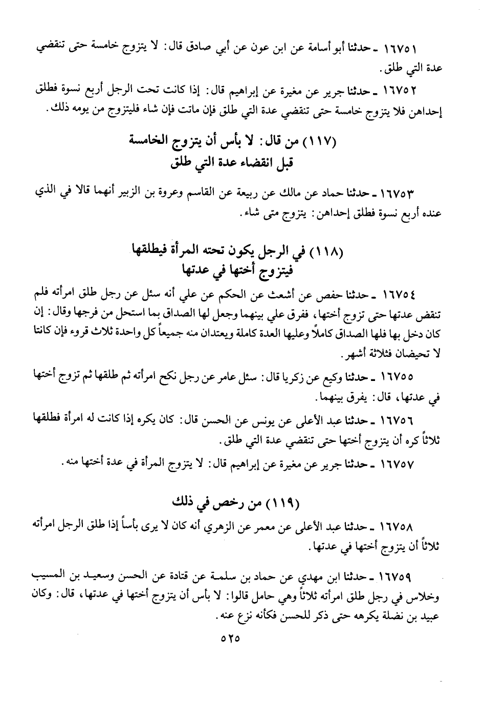 16753 - حَمَّادٌ، عَنْ مَالِكٍ، عَنْ رَبِيعَةَ، عَنِ الْقَاسِمِ، وَعُرْوَةَ بْنِ الزُّبَيْرِ أَنَّهُمَا قَالَا: فِي §الَّذِي عِنْدَهُ أَرْبَعُ نِسْوَةٍ فَطَلَّقَ إِحْدَاهُنَّ: «يَتَزَوَّجُ مَتَى شَاءَ»
