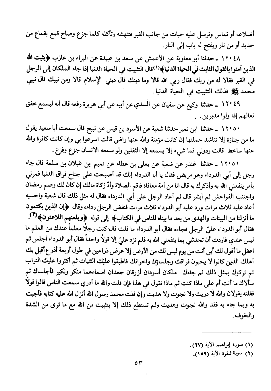 12051 - حَدَّثَنَا غُنْدَرٌ، عَنْ شُعْبَةَ، عَنْ يَعْلَى بْنِ عَطَاءٍ، عَنْ تَمِيمٍ، عَنْ غَيْلَانَ بْنِ سَلَمَةَ، قَالَ جَاءَ رَجُلٌ إِلَى أَبِي الدَّرْدَاءِ وَهُوَ مَرِيضٌ فَقَالَ: يَا أَبَا الدَّرْدَاءِ إِنَّكَ قَدْ أَصْبَحْتَ عَلَى جَنَاحِ فِرَاقِ الدُّنْيَا فَمُرْنِي بِأَمْرٍ يَنْفَعُنِي اللَّهُ بِهِ، وَأَذْكُرُكَ بِهِ قَالَ: «§إِنَّا مِنْ أُمَّةٍ مُعَافَاةٍ فَأَقُمِ الصَّلَاةَ، وَأَدِّ زَكَاةَ مَالِكِ إِنْ كَانَ لَكَ، وَصُمْ رَمَضَانَ، وَاجْتَنِبِ الْفَوَاحِشَ، ثُمَّ أَبْشِرْ» قَالَ: ثُمَّ أَعَادَ الرَّجُلُ عَلَى أَبِي الدَّرْدَاءِ فَقَالَ لَهُ مِثْلَ ذَلِكَ، قَالَ شُعْبَةُ وَأَحْسَبُهُ أَعَادَ عَلَيْهِ ثَلَاثَ مَرَّاتٍ وَرَدَّ عَلَيْهِ أَبُو الدَّرْدَاءِ ثَلَاثَ مَرَّاتٍ، فَنَفَضَ الرَّجُلُ رِدَاءَهُ وَقَالَ: {إِنَّ الَّذِينَ يَكْتُمُونَ مَا أَنْزَلْنَا مِنَ الْبَيِّنَاتِ وَالْهُدَى مِنْ بَعْدِ مَا بَيَّنَّاهُ لِلنَّاسِ فِي الْكِتَابِ} [البقرة: 159] إِلَى قَوْلِهِ {وَيَلْعَنُهُمُ اللَّاعِنُونَ} [البقرة: 159] فَقَالَ أَبُو الدَّرْدَاءِ: عَلَيَّ بِالرَّجُلِ فَجَاءَهُ فَقَالَ أَبُو الدَّرْدَاءِ مَا قُلْتَ: قَالَ: كُنْتَ رَجُلًا مُعَلِّمًا عِنْدَكَ مِنَ الْعِلْمِ مَا لَيْسَ عِنْدِي فَأَرَدْتُ أَنْ تُحَدِّثَنِي بِمَا يَنْفَعُنِي اللَّهُ بِهِ فَلَمْ تَزِدْ عَلَيَّ إِلَّا قَوْلًا وَاحِدًا فَقَالَ أَبُو الدَّرْدَاءِ: " اجْلِسْ، ثُمَّ اعْقِلْ مَا أَقُولُ لَكَ، أَيْنَ أَنْتَ مِنْ يَوْمٍ لَيْسَ لَكَ مِنَ الْأَرْضِ إِلَّا عَرْضُ ذِرَاعَيْنِ فِي طُولِ أَرْبَعَةِ أَذْرُعٍ أَقْبَلَ بِكَ أَهْلُكَ الَّذِينَ كَانُوا لَا يُحِبُّونَ فِرَاقَكَ وَجُلَسَاؤُكَ وَإِخْوَانُكَ، فَأَطْبَقُوا عَلَيْكَ الثَّنِيَّاتِ، ثُمَّ أَكْثَرُوا عَلَيْكَ التُّرَابَ، ثُمَّ تَرَكُوكَ بِمِثْلِ ذَلِكَ، ثُمَّ جَاءَكَ مَلَكَانِ أَسْوَدَانِ أَزْرَقَانِ جَعْدَانِ أَسْمَاءَهُمَا مُنْكَرٌ، وَنَكِيرٌ فَأَجْلَسَاكَ، ثُمَّ سَأَلَاكَ مَا أَنْتَ أَمْ عَلَى مَاذَا كُنْتُ، ثُمَّ مَاذَا تَقُولُ فِي هَذَا، فَإِنْ قُلْتُ وَاللَّهِ مَا أَدْرِي سَمِعْتُ النَّاسَ قَالُوا قَوْلًا فَقُلْتُهُ وَاللَّهِ لَا دَرَيْتَ وَلَا نَجَوْتَ وَلَا هُدِيتَ، وَإِنْ قُلْتَ: مُحَمَّدٌ رَسُولُ اللَّهِ أَنْزَلَ اللَّهُ عَلَيْهِ كِتَابَهُ فَأَجَبْتُ بِهِ وَبِمَا جَاءَ بِهِ فَقَدْ وَاللَّهِ نَجَوْتَ وَهُدِيتَ وَلَمْ تَسْتَطِعْ ذَلِكَ إِلَّا بِتَثْبِيتٍ مِنَ اللَّهِ مَعَ مَا تَرَى مِنَ الشِّدَّةِ وَالْخَوْفِ "