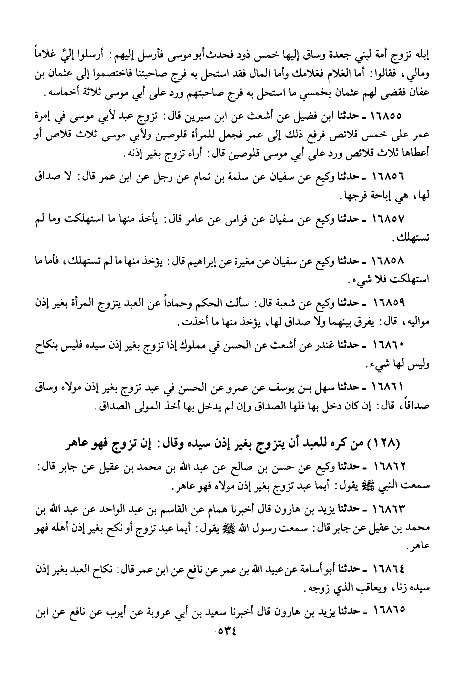 16862 - حَدَّثَنَا وَكِيعٌ، عَنْ حَسَنِ بْنِ صَالِحٍ، عَنْ عَبْدِ اللَّهِ بْنِ مُحَمَّدِ بْنِ عَقِيلٍ، عَنْ جَابِرٍ، قَالَ: سَمِعْتُ النَّبِيَّ صَلَّى اللهُ عَلَيْهِ وَسَلَّمَ يَقُولُ: «§أَيُّمَا عَبْدٍ تَزَوَّجَ بِغَيْرِ إِذْنِ مَوْلَاهُ فَهُوَ عَاهِرٌ»