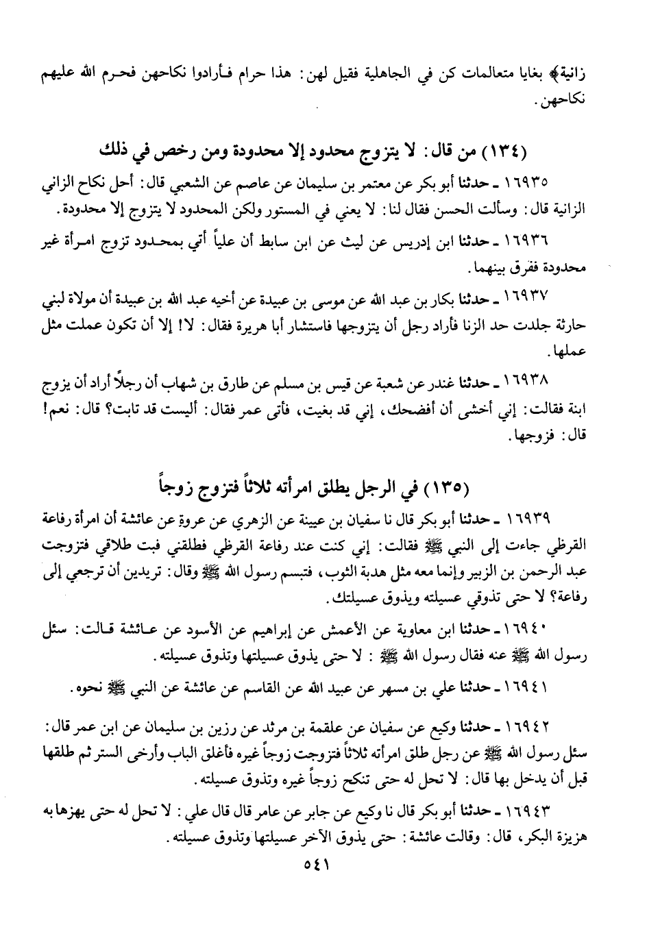16939 - حَدَّثَنَا أَبُو بَكْرٍ قَالَ: نا سُفْيَانُ بْنُ عُيَيْنَةَ، عَنِ الزُّهْرِيِّ، عَنْ عُرْوَةَ، عَنْ عَائِشَةَ، أَنَّ امْرَأَةَ رِفَاعَةَ الْقُرَظِيِّ جَاءَتْ إِلَى النَّبِيِّ صَلَّى اللهُ عَلَيْهِ وَسَلَّمَ فَقَالَتْ: إِنِّي كُنْتُ عِنْدَ رِفَاعَةَ الْقُرَظِيِّ فَطَلَّقَنِي، فَبَتَّ طَلَاقِي فَتَزَوَّجْتُ عَبْدَ الرَّحْمَنِ بْنَ الزُّبَيْرِ، وَإِنَّمَا مَعَهُ مِثْلُ هُدْبَةِ الثَّوْبِ، فَتَبَسَّمَ رَسُولُ اللَّهِ صَلَّى اللهُ عَلَيْهِ وَسَلَّمَ وَقَالَ: «§تُرِيدِينَ أَنْ تَرْجِعِي إِلَى رِفَاعَةَ؟ لَا، حَتَّى تَذُوقِي عُسَيْلَتَهُ، وَيَذُوقَ عُسَيْلَتَكِ»