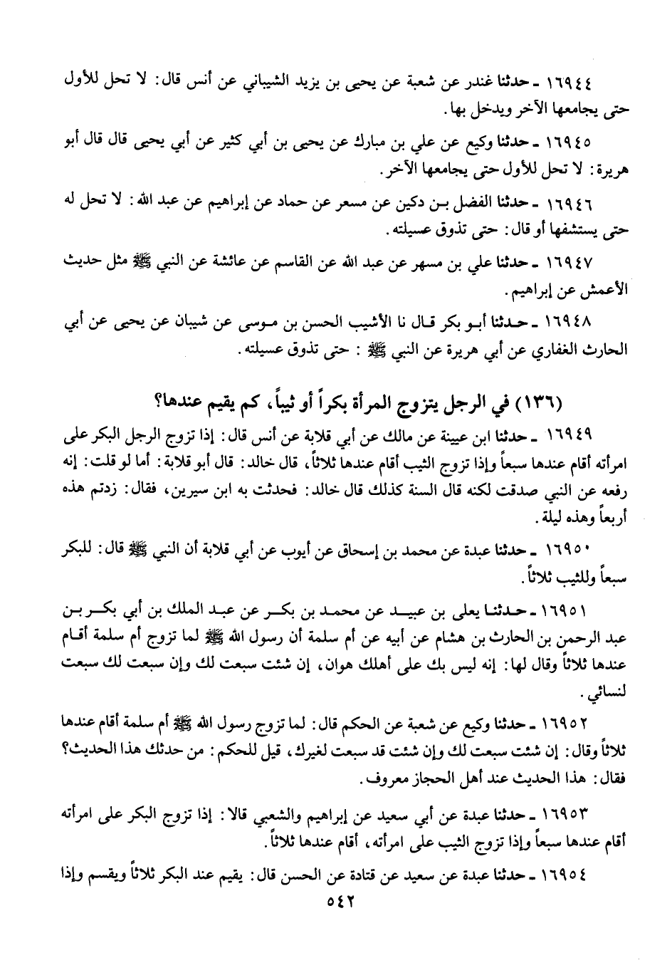 16952 - حَدَّثَنَا وَكِيعٌ، عَنْ شُعْبَةَ، عَنِ الْحَكَمِ، قَالَ: لَمَّا تَزَوَّجَ رَسُولُ اللَّهِ صَلَّى اللهُ عَلَيْهِ وَسَلَّمَ أُمَّ سَلَمَةَ أَقَامَ عِنْدَهَا ثَلَاثًا، وَقَالَ: «§إِنْ شِئْتِ سَبَّعْتُ لَكِ، وَإِنْ شِئْتِ قَدْ سَبَّعْتُ لِغَيْرِكِ». قِيلَ لِلْحَكَمِ: مَنْ حَدَّثَكَ هَذَا الْحَدِيثَ؟ فَقَالَ: «هَذَا الْحَدِيثُ عِنْدَ أَهْلِ الْحِجَازِ مَعْرُوفٌ»