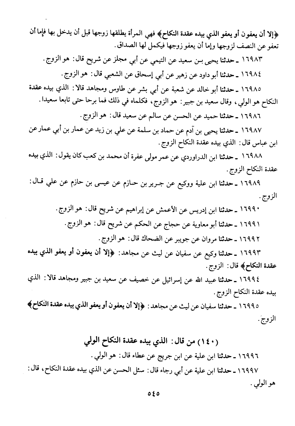 16985 - حَدَّثَنَا أَبوُ خَالِدٍ، عَنْ شُعْبَةَ، عَنْ أَبِي بِشْرٍ، عَنْ طَاوُسٍ، وَمُجَاهِدٍ، قَالَا: " {§الَّذِي بِيَدِهِ عُقْدَةُ النِّكَاحِ} [البقرة: 237] هُوَ الْوَلِيُّ "، وَقَالَ سَعِيدُ بْنُ جُبَيْرٍ: «هُوَ الزَّوْجُ، فَكَلَّمَاهُ فِي ذَلِكَ فَمَا بَرِحَا حَتَّى تَابَعَا سَعِيدًا»