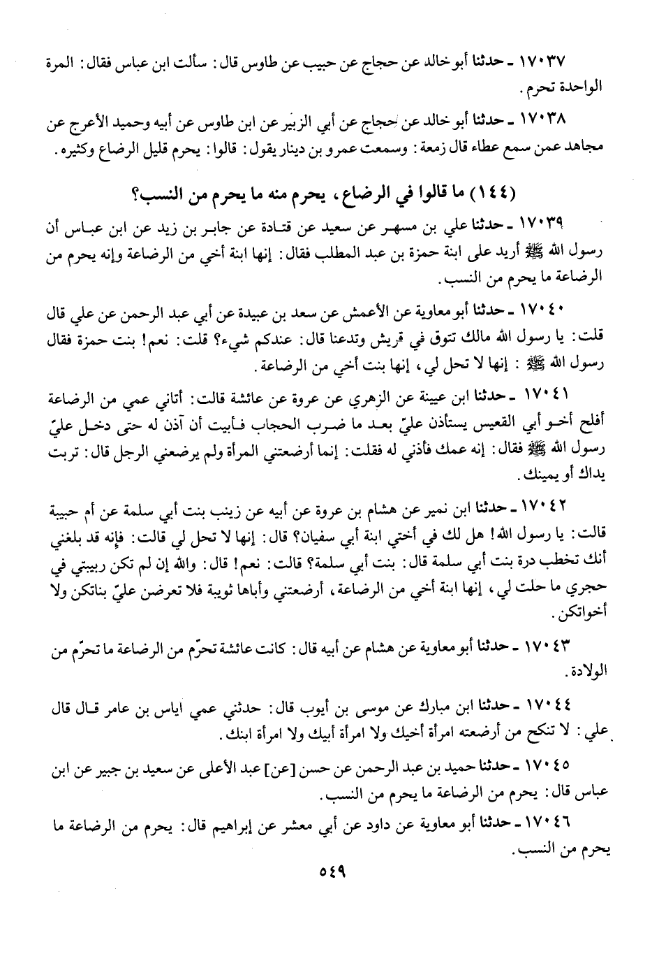 17039 - حَدَّثَنَا عَلِيُّ بْنُ مُسْهِرٍ، عَنْ سَعِيدٍ، عَنْ قَتَادَةَ، عَنْ جَابِرِ بْنِ زَيْدٍ، عَنِ ابْنِ عَبَّاسٍ، أَنَّ رَسُولَ اللَّهِ صَلَّى اللهُ عَلَيْهِ وَسَلَّمَ أُرِيدَ عَلَى ابْنَةِ حَمْزَةَ بْنِ عَبْدِ الْمُطَّلِبِ فَقَالَ: «إِنَّهَا ابْنَةُ أَخِي مِنَ الرَّضَاعَةِ، وَإِنَّهُ §يَحْرُمُ مِنَ الرَّضَاعَةِ مَا يَحْرُمُ مِنَ النَّسَبِ»