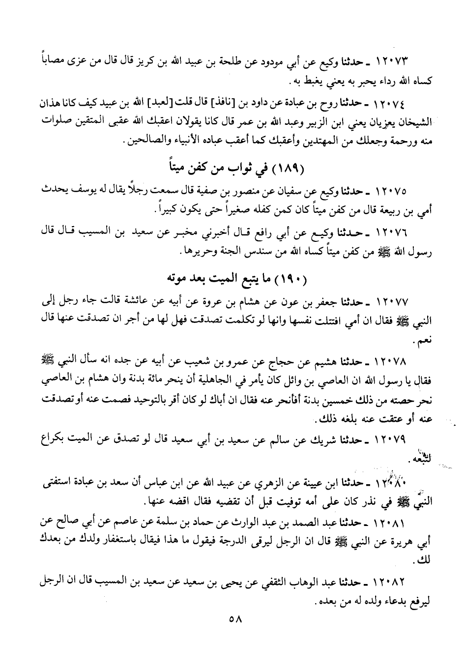 12073 - حَدَّثَنَا وَكِيعٌ، عَنْ أَبِي مَوْدُودَ، عَنْ طَلْحَةَ بْنِ عُبَيْدِ اللَّهِ بْنِ كَرِيزٍ، قَالَ: قَالَ: «§مَنْ عَزَّى مُصَابًا كَسَاهُ اللَّهُ رِدَاءً يُحْبَرُ بِهِ»، يَعْنِي يَغْبِطُ بِهِ