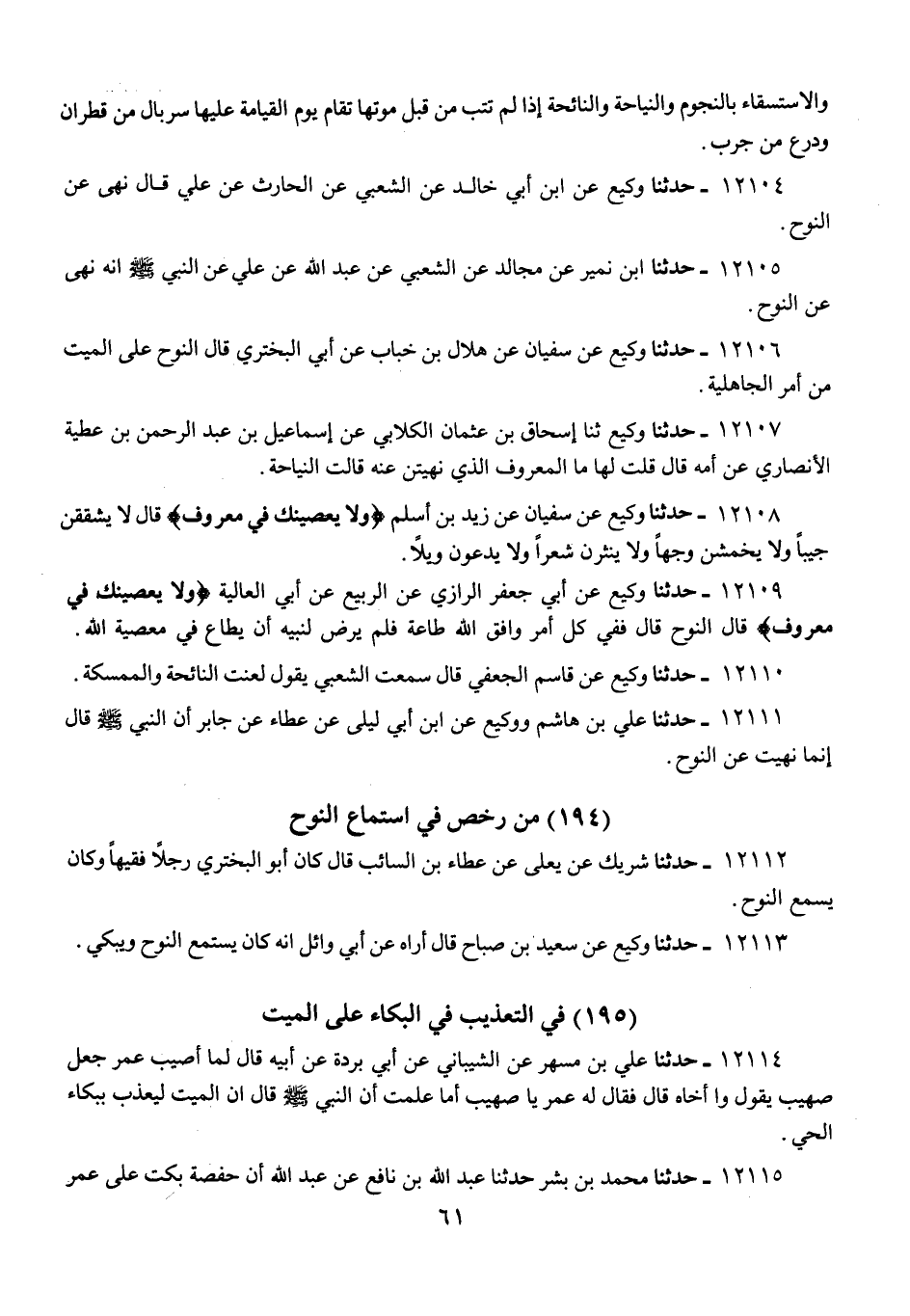 12113 - حَدَّثَنَا وَكِيعٌ، عَنْ سَعِيدِ بْنِ صَبَّاحٍ، قَالَ: أَرَاهُ عَنْ أَبِي وَائِلٍ، أَنَّهُ كَانَ «§يَسْتَمِعُ النَّوْحَ وَيَبْكِي»