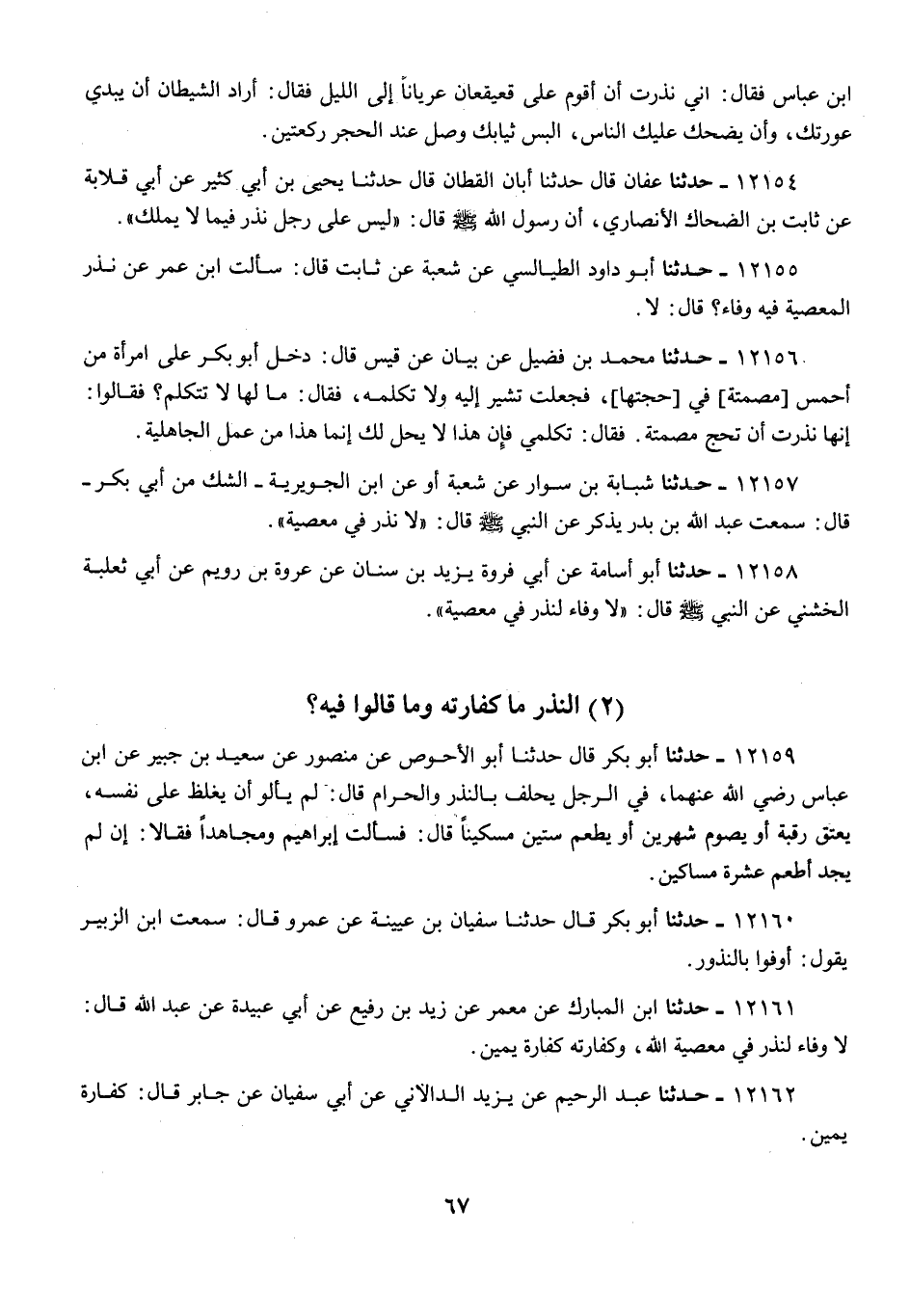12157 - حَدَّثَنَا شَبَابَةُ بْنُ سَوَّارٍ، عَنْ شُعْبَةَ، أَوْ عَنِ أَبي الْجُوَيْرِيَةِ الشَّكُّ، مِنْ أَبِي بَكْرٍ، قَالَ: سَمِعْتُ عَبْدَ اللَّهِ بْنَ بَدْرٍ، يَذْكُرُ عَنِ النَّبِيِّ صَلَّى اللهُ عَلَيْهِ وَسَلَّمَ قَالَ: «§لَا نَذْرَ فِي مَعْصِيَةٍ»