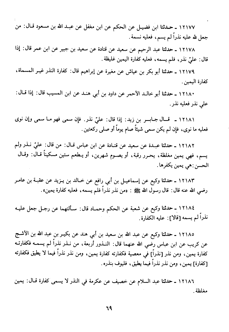 12186 - عَبْدُ السَّلَامِ، عَنْ خُصَيْفٍ، عَنْ عِكْرِمَةَ، فِي §النَّذْرِ لَا يُسَمِّي كَفَّارَةً قَالَ: «يَمِينٌ مُغَلَّظَةٌ»