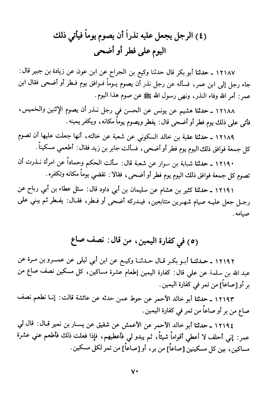 12190 - شَبَابَةُ بْنُ سَوَّارٍ، عَنْ شُعْبَةَ، قَالَ: سَأَلْتُ الْحَكَمَ، وَحَمَّادًا، عَنْ §امْرَأَةٍ نَذَرَتْ أَنْ تَصُومَ كُلَّ جُمُعَةٍ، فَوَافَقَ ذَلِكَ الْيَوْمُ يَوْمَ فِطْرٍ، أَوْ أَضْحَى، فَقَالَ: «تَقْضِي يَوْمًا مَكَانَهُ وَتُكَفِّرُهُ»