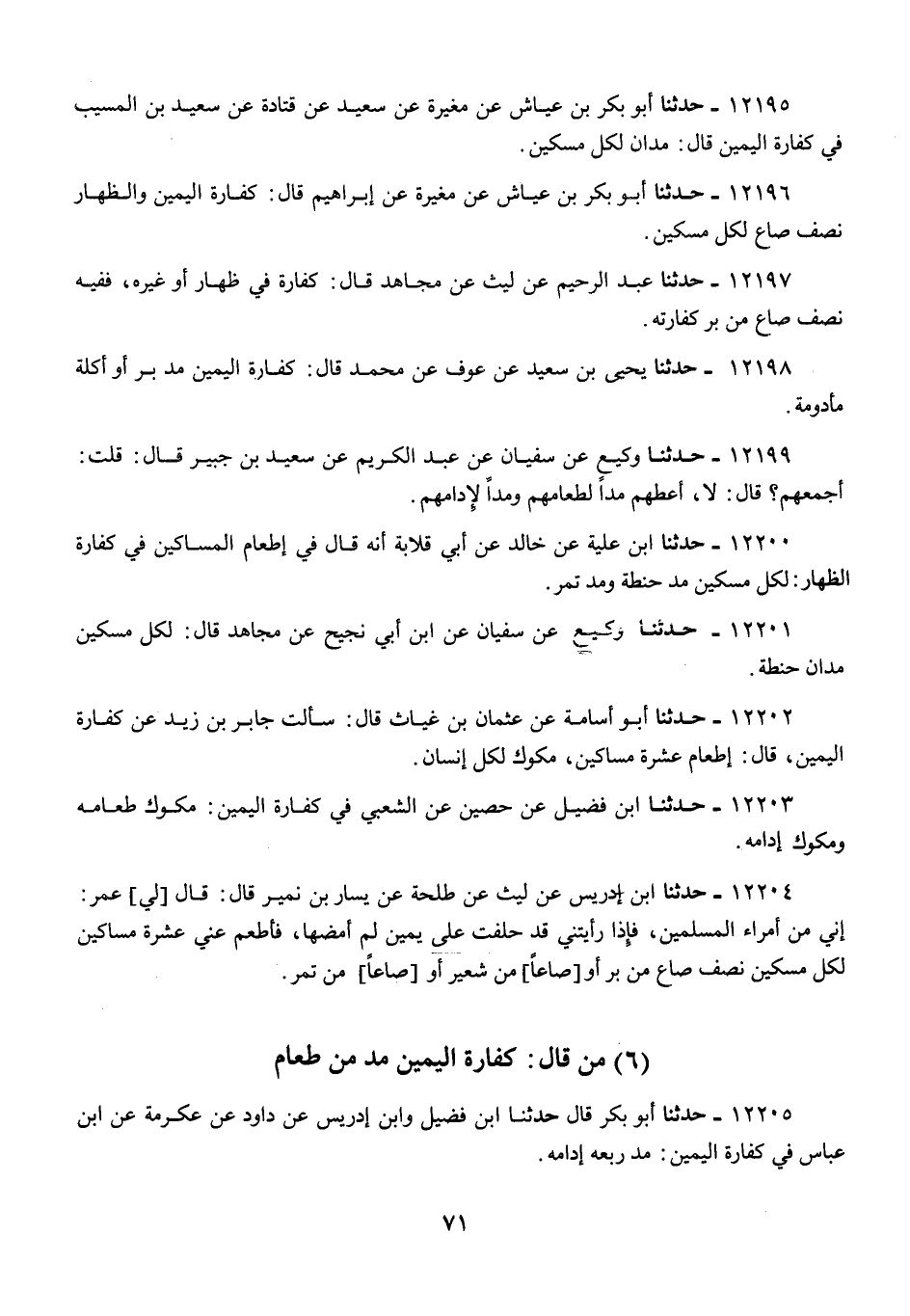 12205 - أَبُو بَكْرٍ قَالَ: حَدَّثَنَا ابْنُ فُضَيْلٍ، وَابْنُ إِدْرِيسَ، عَنْ دَاوُدَ، عَنْ عِكْرِمَةَ، عَنِ ابْنِ عَبَّاسٍ، فِي كَفَّارَةِ الْيَمِينِ: «§مُدٌّ رُبُعُهُ إِدَامُهُ»