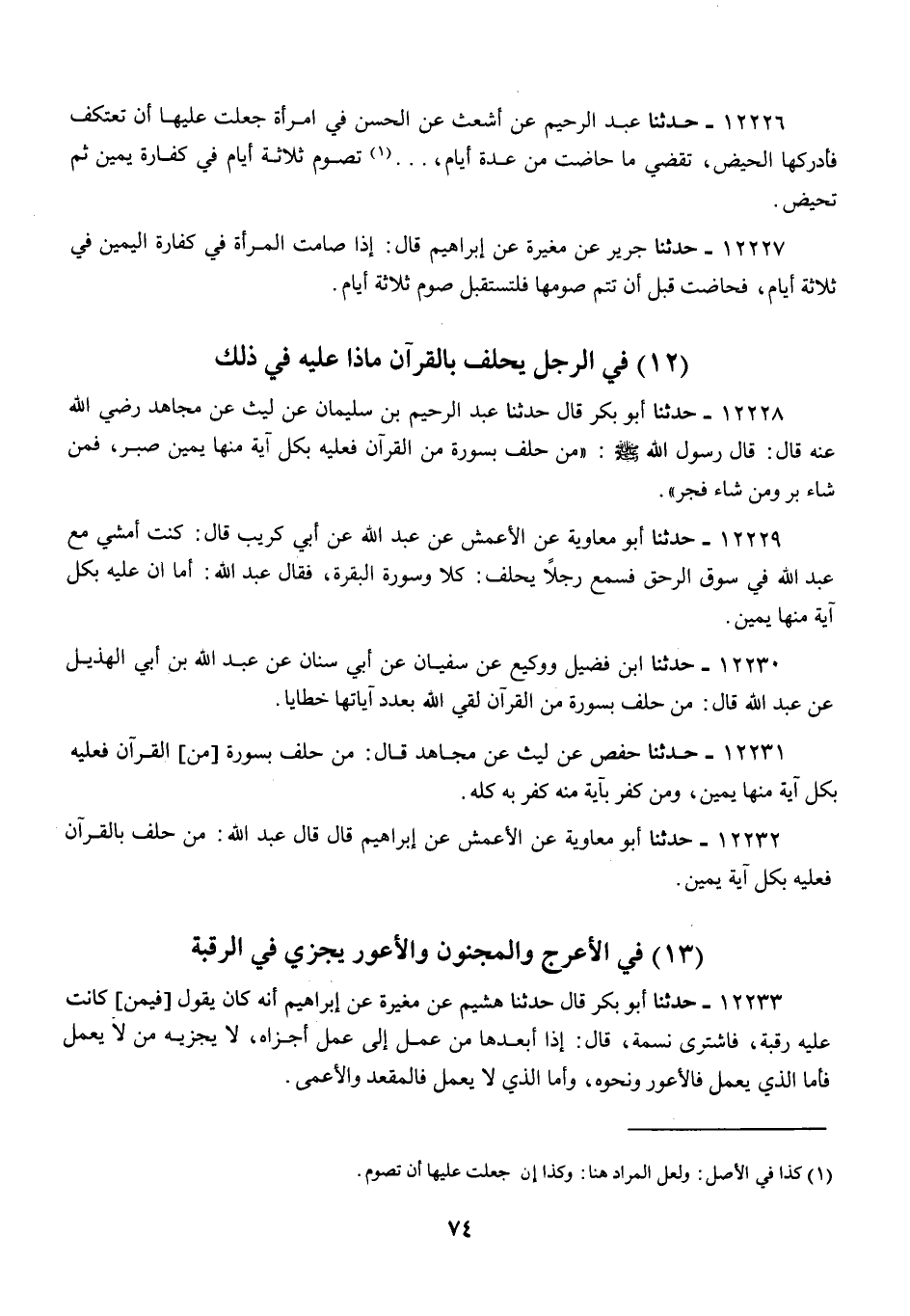 12232 - أَبُو مُعَاوِيَةَ، عَنِ الْأَعْمَشِ، عَنْ إِبْرَاهِيمَ، قَالَ: قَالَ عَبْدُ اللَّهِ: «§مَنْ حَلَفَ بِالْقُرْآنِ فَعَلَيْهِ بِكُلِّ آيَةٍ يَمِينٌ»