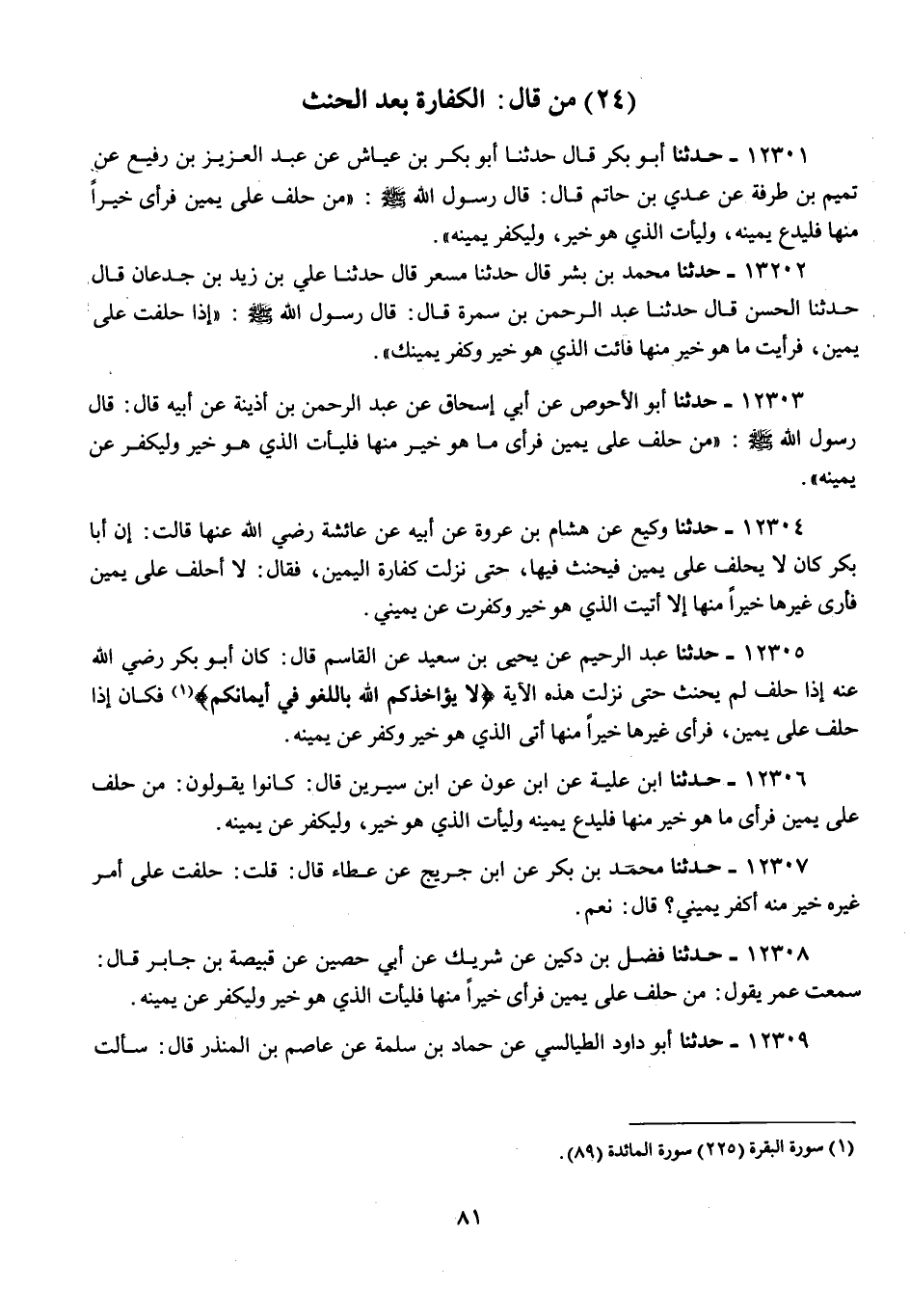 12301 - أَبُو بَكْرٍ قَالَ: حَدَّثَنَا أَبُو بَكْرِ بْنُ عَيَّاشٍ، عَنْ عَبْدِ الْعَزِيزِ بْنِ رُفَيْعٍ، عَنْ تَمِيمِ بْنِ طُرْفَةَ، عَنْ عَدِيِّ بْنِ حَاتِمٍ، قَالَ: قَالَ رَسُولُ اللَّهِ صَلَّى اللهُ عَلَيْهِ وَسَلَّمَ: «§مَنْ حَلَفَ عَلَى يَمِينٍ فَرَأَى خَيْرًا مِنْهَا فَلْيَدَعْ يَمِينَهُ، وَلْيَأْتِ الَّذِي هُوَ خَيْرٌ، وَلْيُكَفِّرْ يَمِينَهُ»