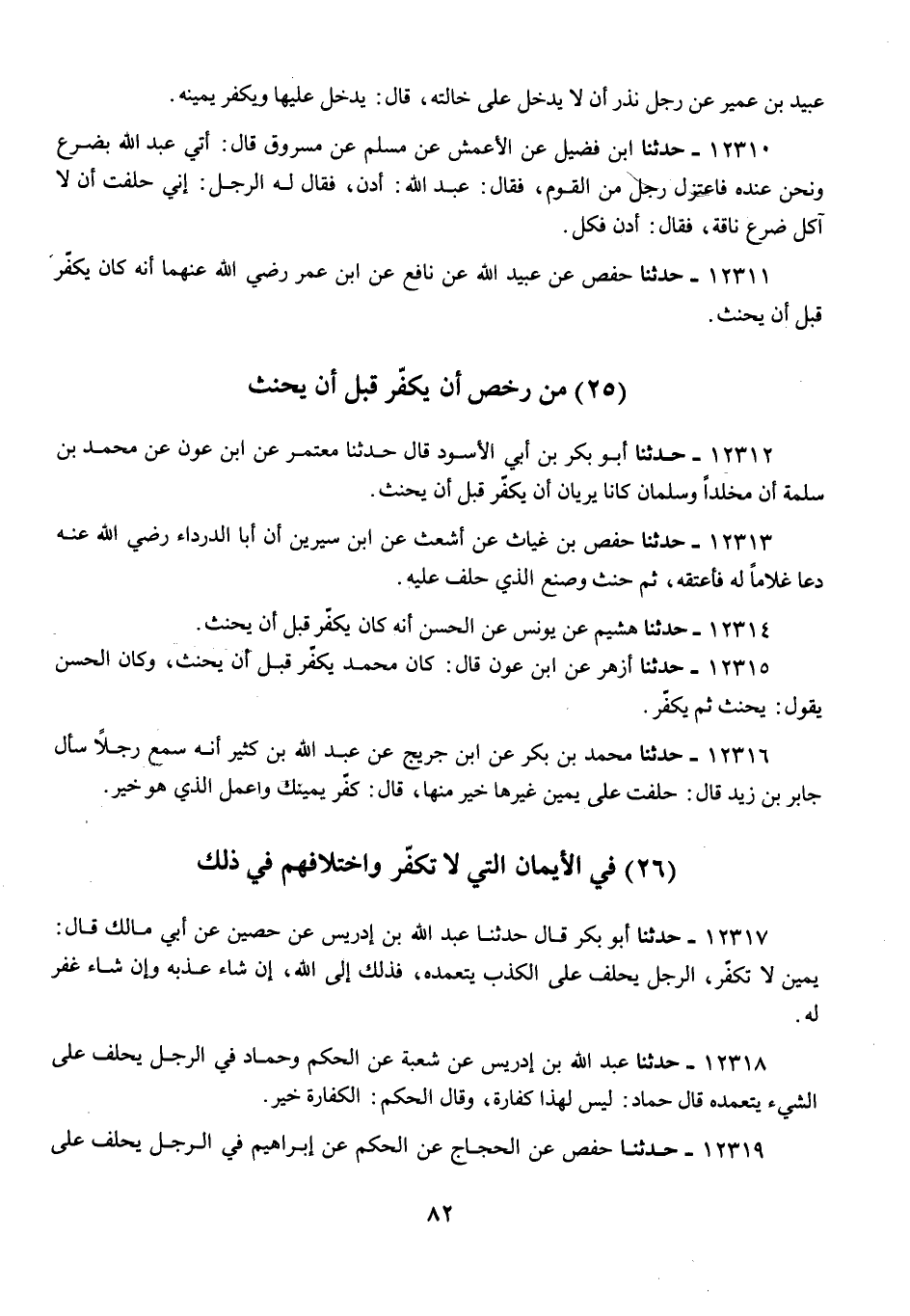 12316 - مُحَمَّدُ بْنُ بَكْرٍ، عَنِ ابْنِ جُرَيْجٍ، عَنْ عَبْدِ اللَّهِ بْنِ كَثِيرٍ، أَنَّهُ سَمِعَ رَجُلًا سَأَلَ جَابِرَ بْنَ زَيْدٍ، قَالَ: حَلَفْتُ عَلَى يَمِينٍ غَيْرُهَا خَيْرٌ مِنْهَا، قَالَ: «§كَفِّرْ يَمِينَكَ، وَاعْمَلِ الَّذِي هُوَ خَيْرٌ»
