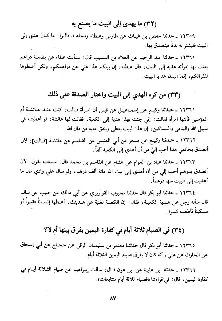 12360 - عَبْدُ الرَّحِيمِ، عَنِ الْعَلَاءِ بْنِ الْمُسَيِّبِ، قَالَ: سَأَلْتُ عَطَاءً، عَنْ بِضْعَةِ دَرَاهِمَ بَعَثَتْ بِهَا امْرَأَتُهُ هَدِيَّةً إِلَى الْبَيْتِ، قَالَ عَطَاءٌ: «§إِنَّ بَيْتَكُمْ هَذَا غَنِيٌّ عَنْ دَرَاهِمِكُمْ، وَلَكِنْ أَعْطُوهَا لِفُقَرَائِكُمْ، إِنَّمَا الْبُدْنُ هَدَايَا الْبَيْتِ»
