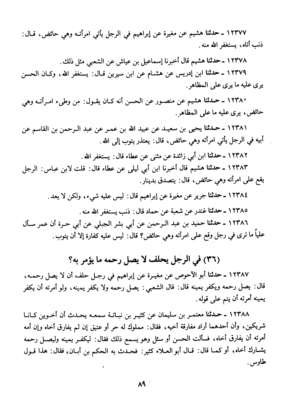 12377 - هُشَيْمٌ، عَنْ مُغِيرَةَ، عَنْ إِبْرَاهِيمَ فِي §الرَّجُلِ يَأْتِي امْرَأَتَهُ وَهِيَ حَائِضٌ، قَالَ: «ذَنْبٌ أَتَاهُ، يَسْتَغْفِرُ اللَّهَ مِنْهُ»