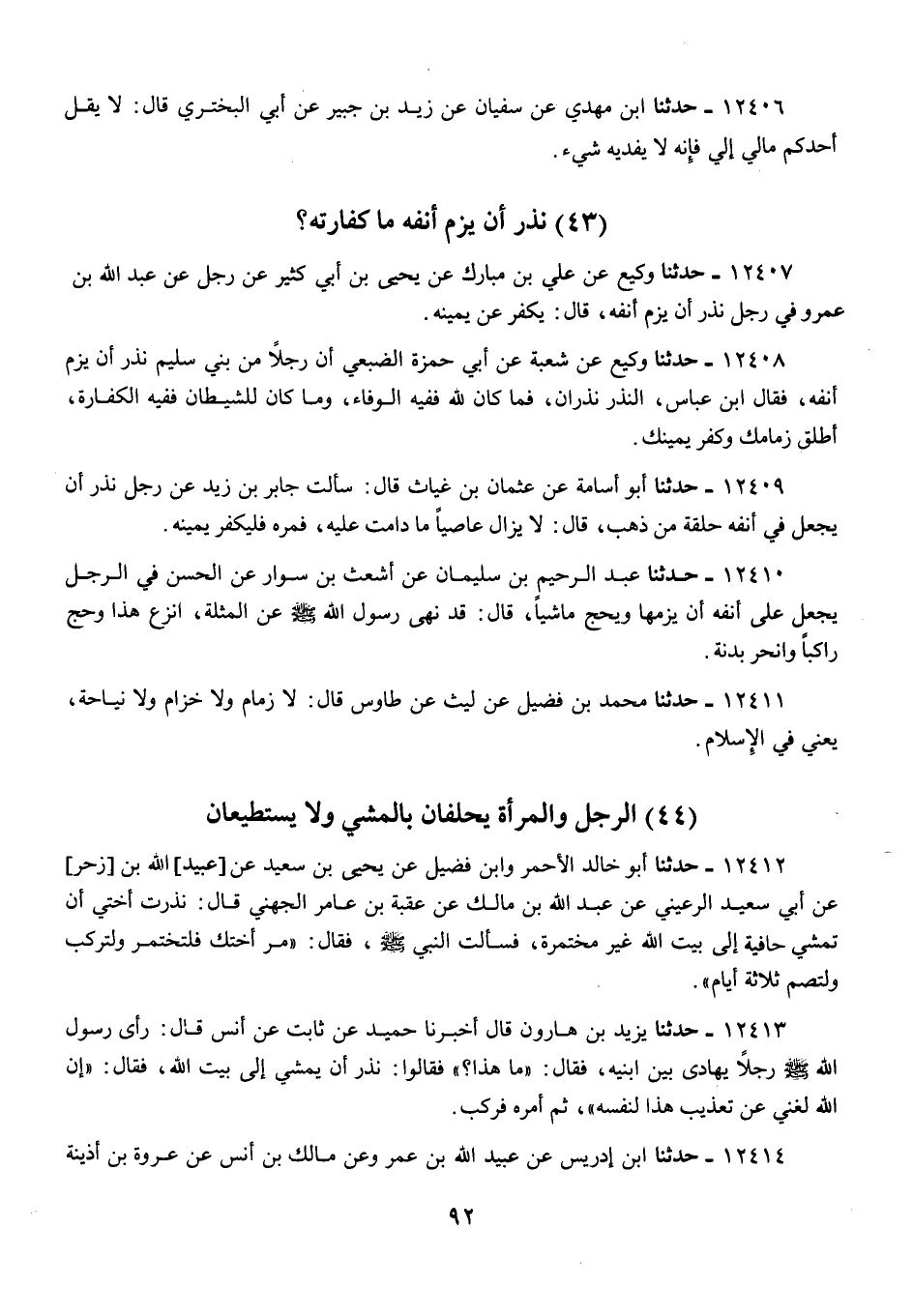12407 - وَكِيعٌ، عَنْ عَلِيِّ بْنِ مُبَارَكٍ، عَنْ يَحْيَى بْنِ أَبِي كَثِيرٍ، عَنْ رَجُلٍ، عَنْ عَبْدِ اللَّهِ بْنِ عَمْرٍو، فِي §رَجُلٍ نَذَرَ أَنْ يَزُمَّ أَنْفَهُ، قَالَ: «يُكَفِّرُ عَنْ يَمِينِهِ»