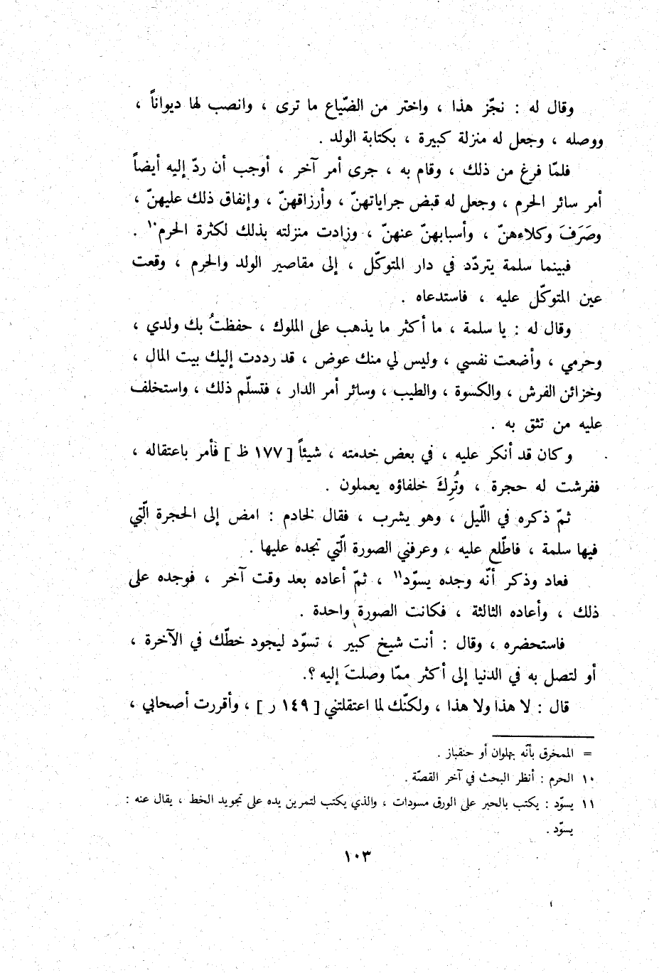وَقَالَ لَهُ: يَا سَلمَة، مَا أَكثر مَا يذهب على الْمُلُوك، حفظت بك وَلَدي وحرمي، وأضعت نَفسِي، وَلَيْسَ لي مِنْك عوض، قد رددت إِلَيْك بَيت المَال، وخزائن الْفرش، وَالْكِسْوَة، وَالطّيب، وَسَائِر أَمر الدَّار، فتسلم ذَلِك، واستخلف عَلَيْهِ من تثق بِهِ.