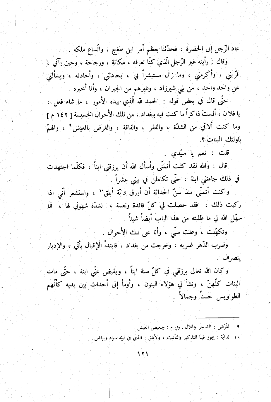 حَتَّى قَالَ فِي بعض قَوْله: الْحَمد لله الَّذِي بِيَدِهِ الْأُمُور، مَا شَاءَ فعل، يَا فلَان، أَلَسْت ذَاكِرًا مَا كنت فِيهِ بِبَغْدَاد، من تِلْكَ الْأَحْوَال الخسيسة، وَمَا كنت أُلَاقِي من الشدَّة، والفقر، والفاقة، وَالْغَرَض بالعيش، والهم بأولئك الْبَنَات؟ قلت: نعم، يَا سَيِّدي.