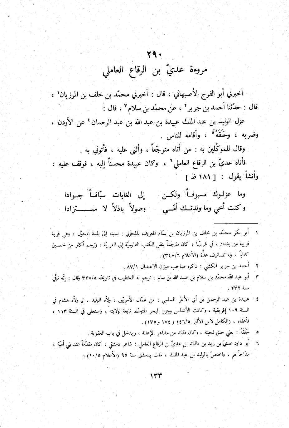 فَأَتَاهُ عدي الرّقاع العاملي، وَكَانَ عُبَيْدَة محسنا إِلَيْهِ، فَوقف عَلَيْهِ، وَأَنْشَأَ يَقُول: