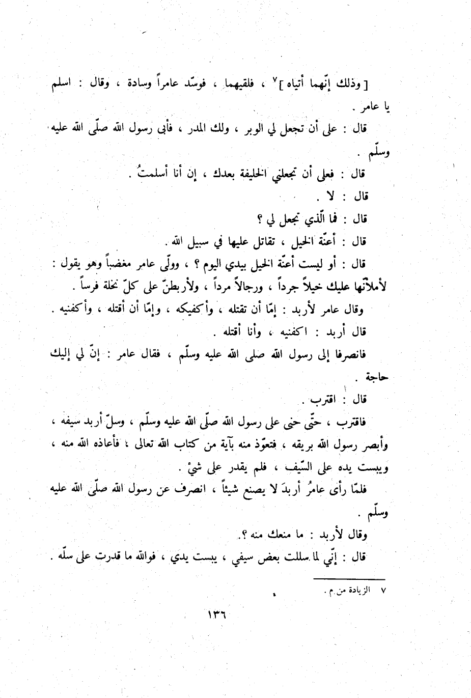 وَذَلِكَ أَنَّهُمَا أَتَيَاهُ، فَلَقِيَهُمَا، فَوَسَّدَ عَامِرًا وِسَادَةً، وَقَالَ: §«أَسْلِمْ، يَا عَامِرُ» .