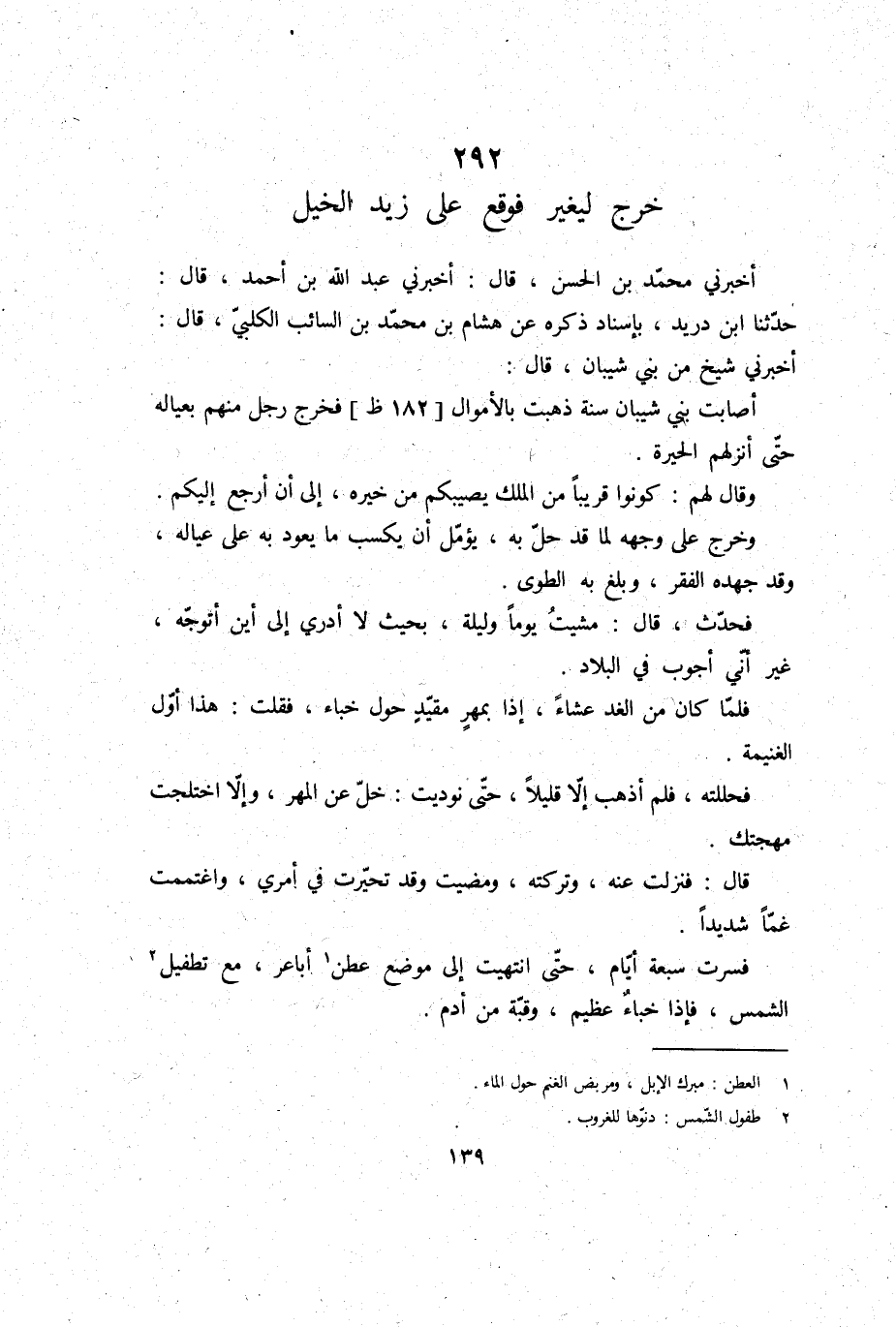 أَخْبرنِي مُحَمَّد بن الْحسن، قَالَ: أَخْبرنِي عبد الله بن أَحْمد، قَالَ: حَدثنَا ابْن دُرَيْد، بِإِسْنَاد ذكره عَن هِشَام بن مُحَمَّد بن السَّائِب الْكَلْبِيّ، قَالَ: أَخْبرنِي شيخ من بني شَيبَان، قَالَ: أَصَابَت بني شَيبَان سنة ذهبت بالأموال، فَخرج رجل مِنْهُم بعياله حَتَّى أنزلهم الْحيرَة.