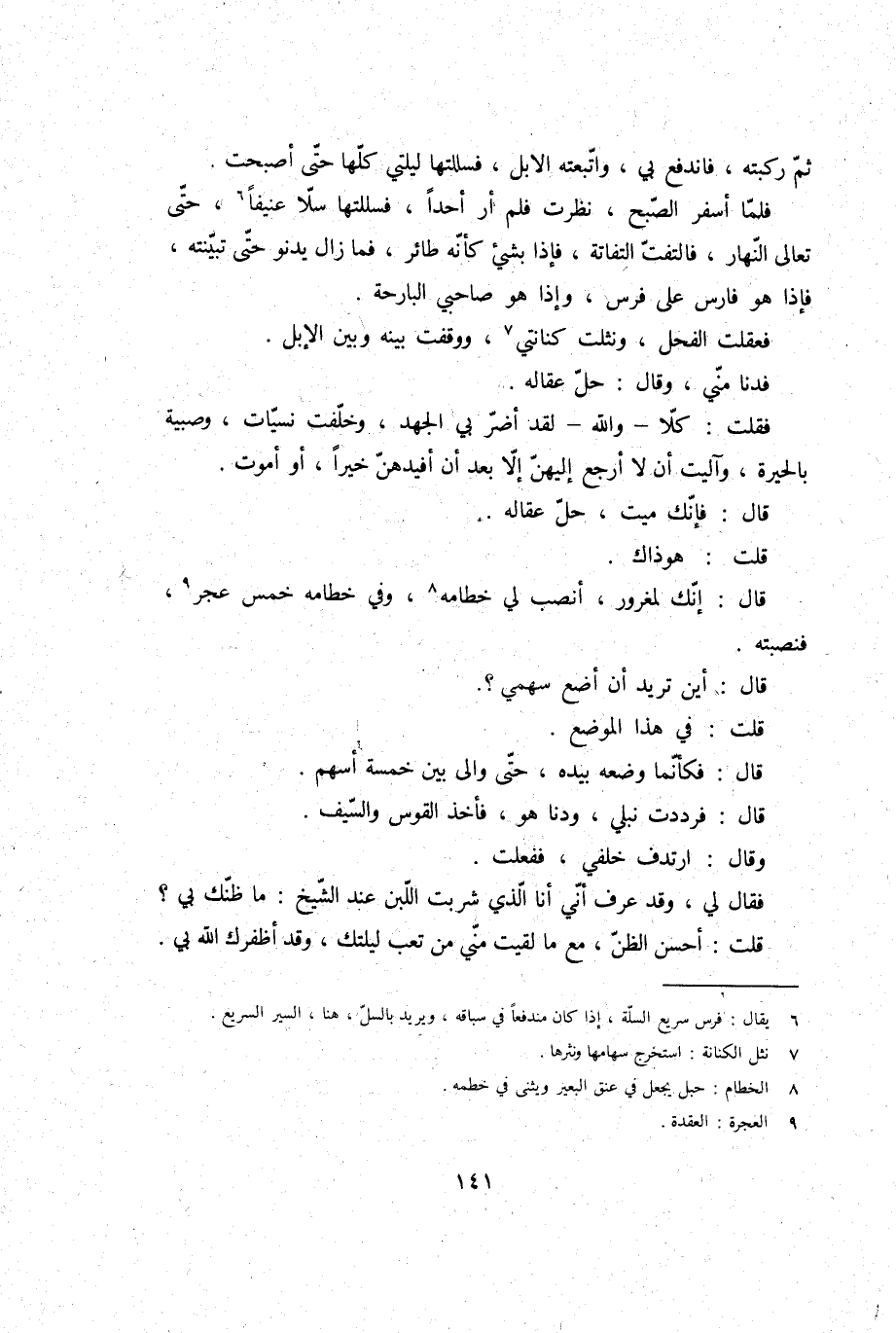 فَلَمَّا أَسْفر الصُّبْح، نظرت فَلم أر أحدا، فسللتها سلا عنيفا، حَتَّى تَعَالَى النَّهَار، فالتفتّ التفاتة، فَإِذا بِشَيْء كَأَنَّهُ طَائِر، فَمَا زَالَ يدنو حَتَّى تبينته، فَإِذا هُوَ فَارس على فرس، وَإِذا هُوَ صَاحِبي البارحة.