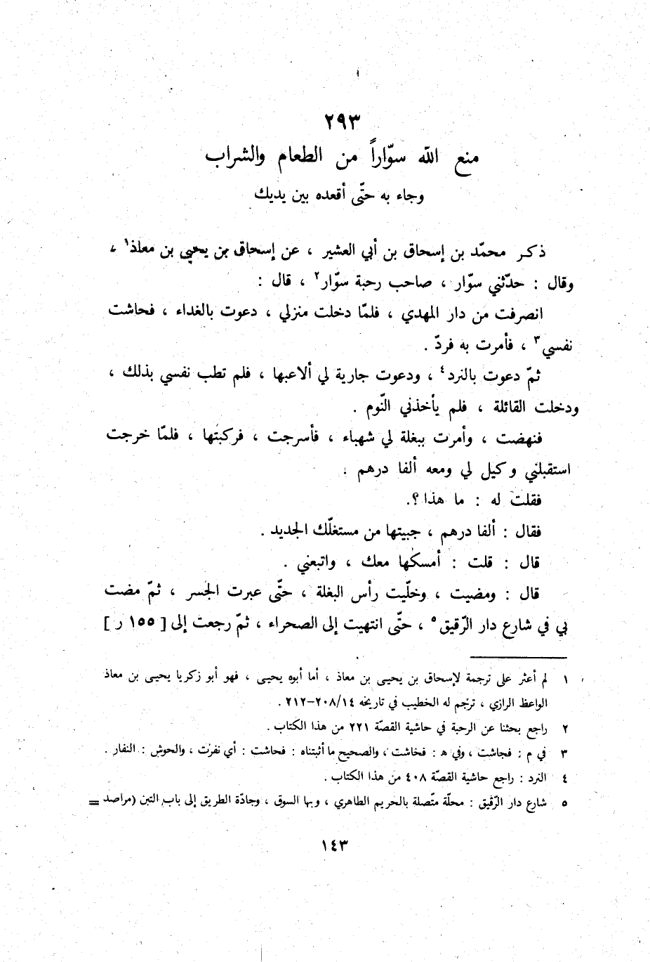 ذكر مُحَمَّد بن إِسْحَاق بن أبي العشير، عَن إِسْحَاق بن يحيى بن معَاذ، وَقَالَ: حَدثنِي سوار، صَاحب رحبة سوار، قَالَ: انصرفت من دَار الْمهْدي، فَلَمَّا دخلت منزلي؛ دَعَوْت بالغداء، فحاشت نَفسِي، فَأمرت بِهِ فَرد.