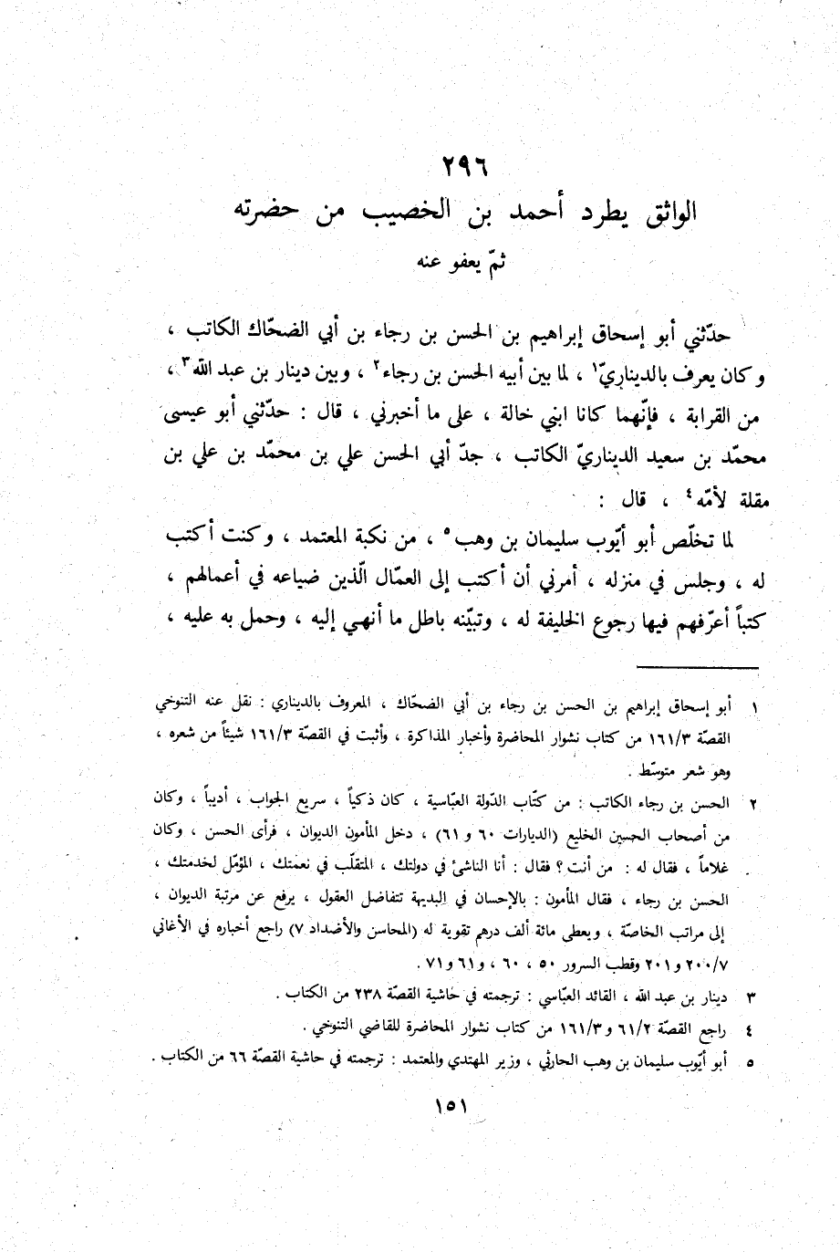 حَدثنِي أَبُو إِسْحَاق إِبْرَاهِيم بن الْحسن بن رَجَاء بن أبي الضَّحَّاك الْكَاتِب، وَكَانَ يعرف بـ: الديناري؛ لما بَين أَبِيه الْحسن بن رَجَاء، وَبَين دِينَار بن عبد الله، من الْقَرَابَة، فَإِنَّهُمَا كَانَ ابْني خَالَة، على مَا أَخْبرنِي، قَالَ: حَدثنِي أَبُو عِيسَى مُحَمَّد بن سعيد الديناري الْكَاتِب، جد أبي الْحسن عَليّ بن مُحَمَّد بن عَليّ بن مقلد لأمه، قَالَ: لما تخلص أَبُو أَيُّوب سُلَيْمَان بن وهب من نكبة الْمُعْتَمد، وَكنت أكتب لَهُ، وَجلسَ فِي منزله؛ أَمرنِي أَن أكتب إِلَى الْعمَّال الَّذين ضيَاعه فِي أَعْمَالهم، كتبا أعرفهم فِيهَا رُجُوع الْخَلِيفَة لَهُ، وتبينه بَاطِل مَا أنهِي إِلَيْهِ، وَحمل بِهِ عَلَيْهِ،