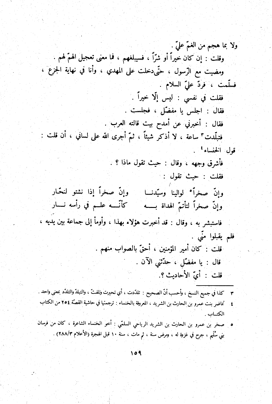 فتبلدت سَاعَة، لَا أذكر شَيْئا، ثمَّ أجْرى الله على لساني، أَن قلت: قَول الخنساء.