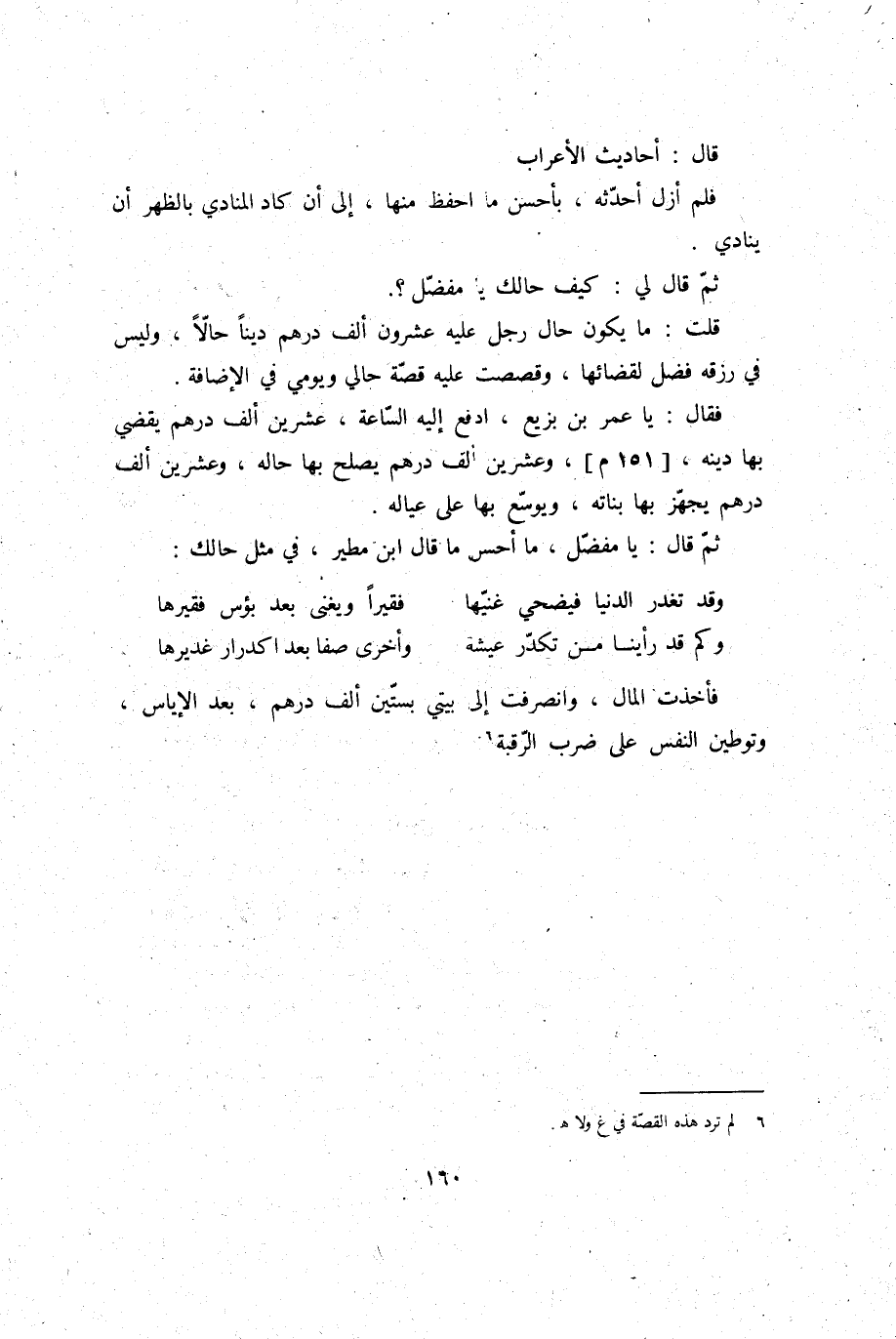 ثمَّ قَالَ لي: كَيفَ حالك، يَا مفضل؟ قلت: مَا يكون حَال رجل عَلَيْهِ عشرُون ألف دِرْهَم دينا حَالا، وَلَيْسَ فِي رزقه فضل لقضائها، وقصصت عَلَيْهِ قصَّة حَالي ويومي فِي الْإِضَافَة.