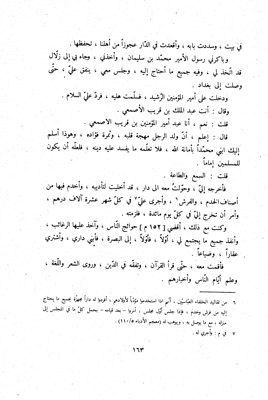 فَأخْرجهُ إِلَيّ، وحولت مَعَه إِلَى دَار، قد أخليت لتأديبه، وَأَخْدَم فِيهَا من أَصْنَاف الخدم والفرش، وَأجْرِي عَليّ فِي كل شهر عشرَة آلَاف دِرْهَم، وَأمر أَن تخرج إِلَيّ فِي كل يَوْم مائدة، فَلَزِمته.