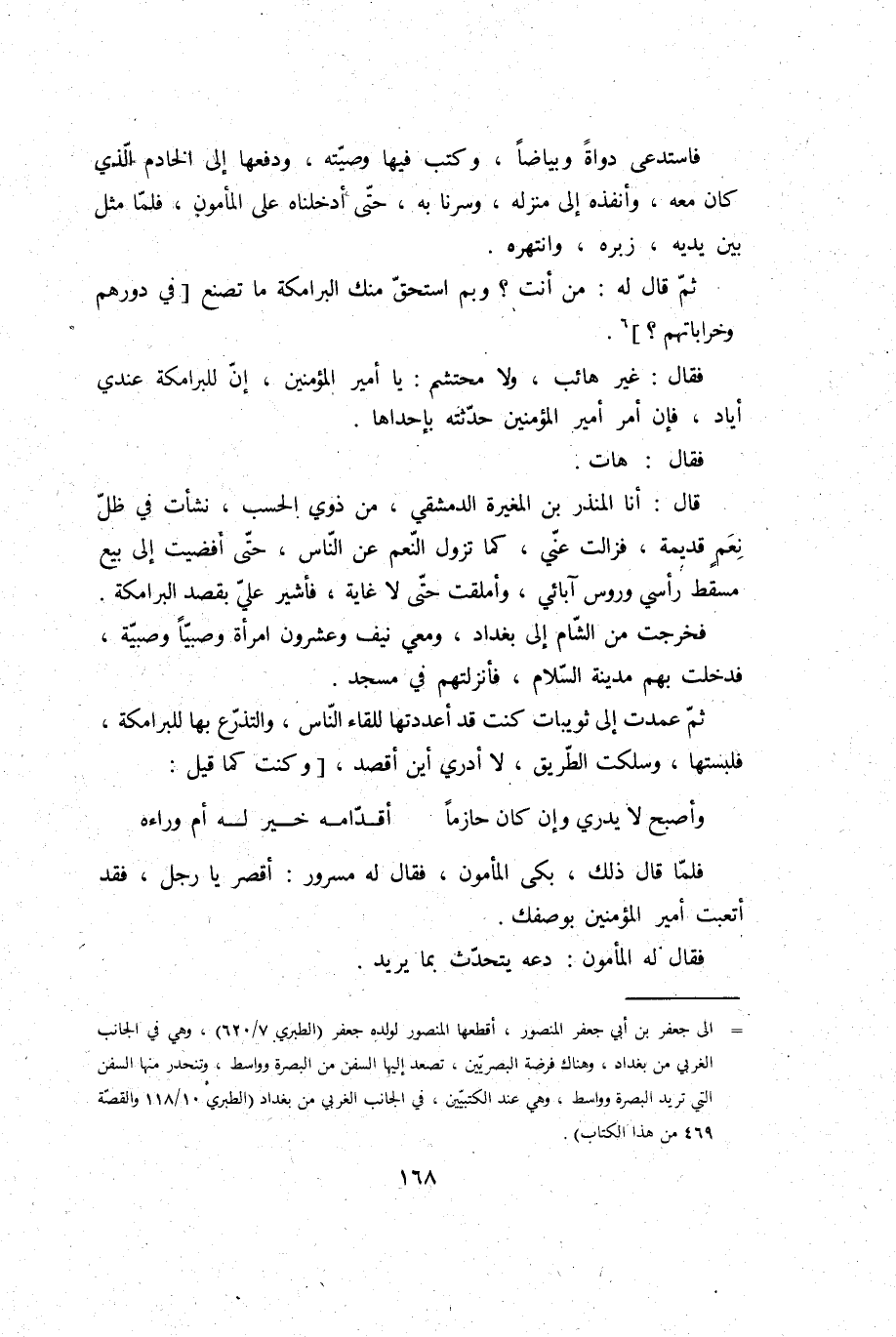 ثمَّ قَالَ لَهُ: من أَنْت؟ وَبِمَ اسْتحق مِنْك البرامكة مَا تصنع فِي دُورهمْ وخراباتهم؟ فَقَالَ غير هائب، وَلَا محتشم: يَا أَمِير الْمُؤمنِينَ، إِن للبرامكة عِنْدِي أياد، فَإِن أَمر أَمِير الْمُؤمنِينَ حدثته بإحداها.