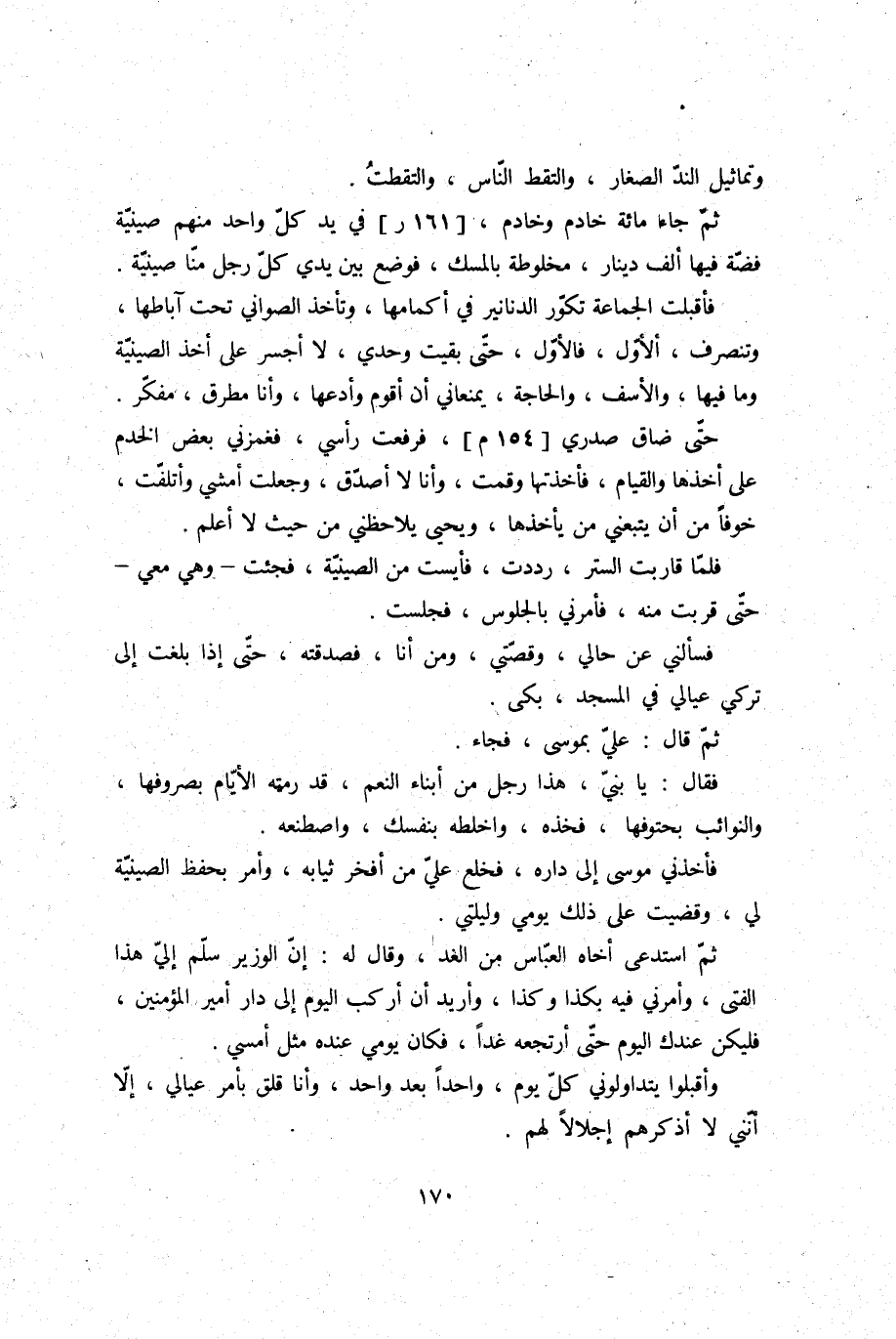 حَتَّى ضَاقَ صَدْرِي، فَرفعت رَأْسِي، فغمزني بعض الخدم على أَخذهَا وَالْقِيَام، فأخذتها وَقمت، وَأَنا لَا أصدق، وَجعلت أَمْشِي وأتلفت، خوفًا من أَن يَتبعني من يَأْخُذهَا، وَيحيى يلاحظني من حَيْثُ لَا أعلم.