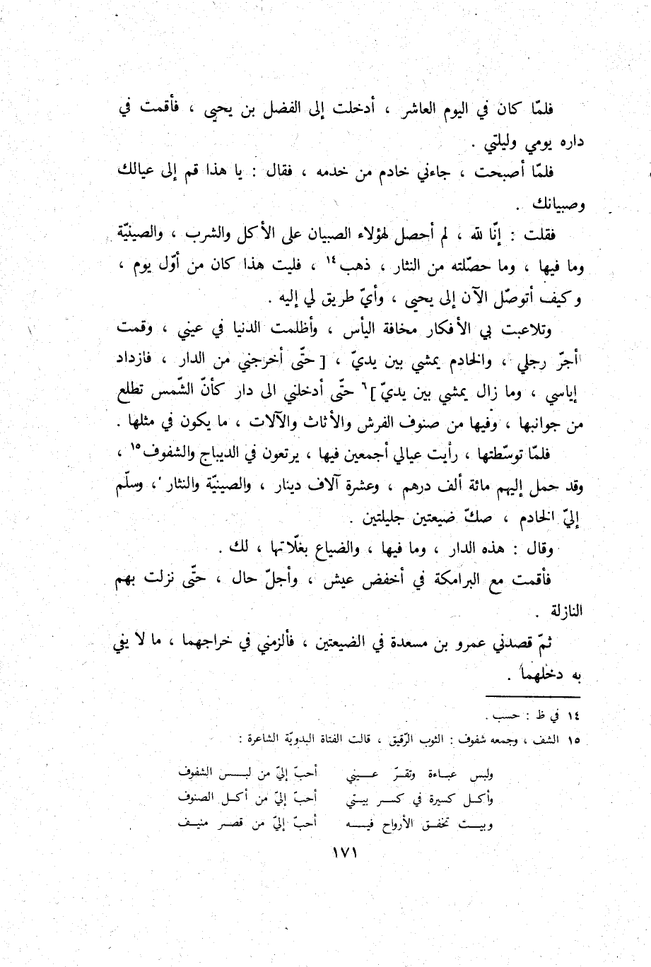 فَقلت: إِنَّا لله، لم أحصل لهَؤُلَاء الصّبيان على الْأكل وَالشرب، والصينية وَمَا فِيهَا، وَمَا حصلته من النثار ذهب، فليت هَذَا كَانَ من أول يَوْم، وَكَيف أتوصل الْآن إِلَى يحيى، وَأي طَرِيق لي إِلَيْهِ؟ وتلاعبت بِي الأفكار مَخَافَة الْيَأْس، وأظلمت الدُّنْيَا فِي عَيْني، وَقمت أجر رجْلي، وَالْخَادِم يمشي بَين يَدي، حَتَّى أخرجني من الدَّار، فازداد إياسي، وَمَا زَالَ يمشي بَين يَدي حَتَّى أدخلني إِلَى دَار كَأَن الشَّمْس تطلع من جوانبها، وفيهَا من صنوف الْفرش والأثاث والآلات، مَا يكون فِي مثلهَا.