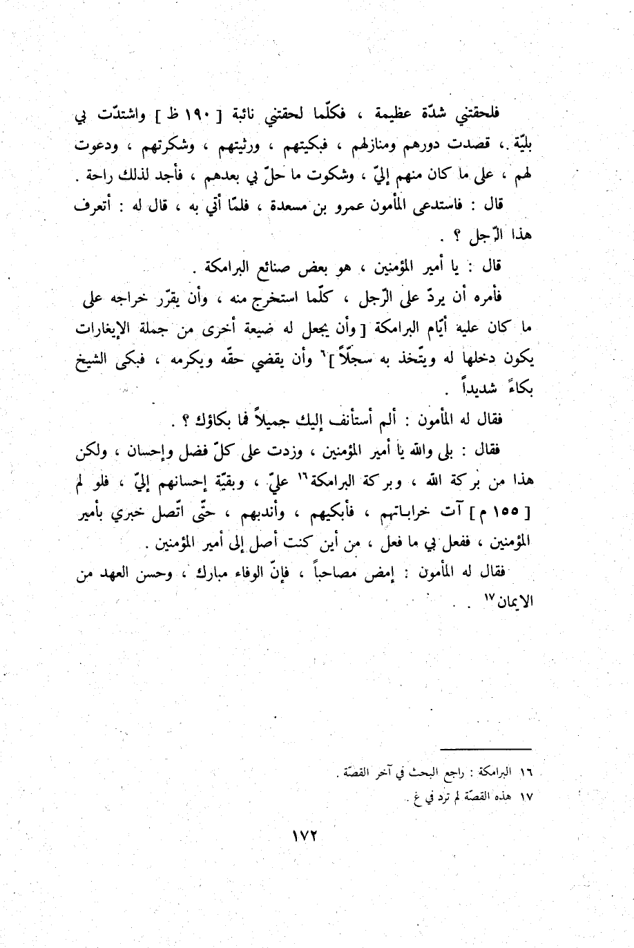 فَقَالَ لَهُ الْمَأْمُون: ألم اسْتَأْنف إِلَيْك جميلا، فَمَا بكاؤك؟ فَقَالَ: بلَى وَالله يَا أَمِير الْمُؤمنِينَ، وزدت على كل فضل وإحسان، وَلَكِن هَذَا من بركَة الله، وبركة البرامكة عَليّ، وَبَقِيَّة إحسانهم إِلَيّ، فَلَو لم آتٍ خراباتهم، فأبكيهم وأندبهم، حَتَّى اتَّصل خبري بأمير الْمُؤمنِينَ، فَفعل بِي مَا فعل، من أَيْن كنت أصل إِلَى أَمِير الْمُؤمنِينَ؟ فَقَالَ لَهُ الْمَأْمُون: امْضِ مصاحبا، فَإِن الْوَفَاء مبارك، وَحسن الْعَهْد من الْإِيمَان.