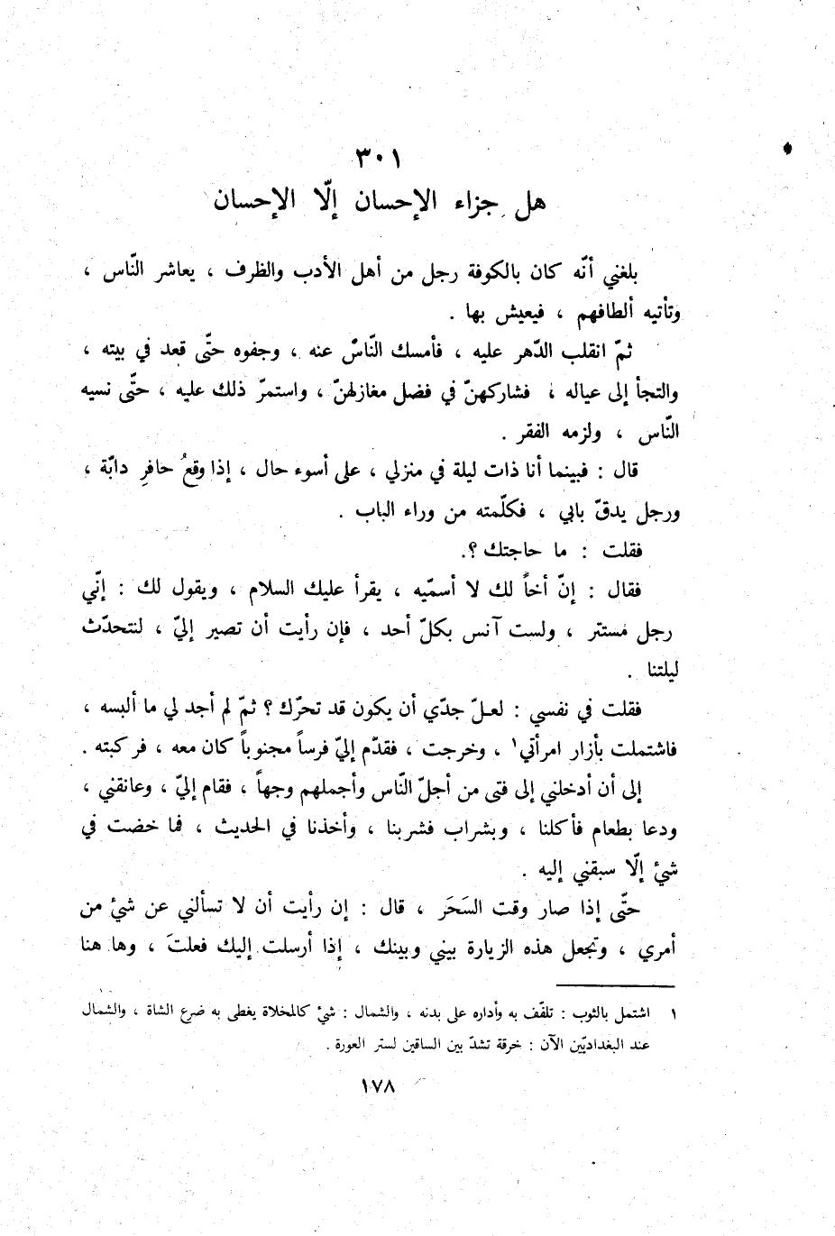 فَقلت فِي نَفسِي: لَعَلَّ جدي أَن يكون قد تحرّك؟ ثمَّ لم أجد لي مَا ألبسهُ، فاشتملت بإزار امْرَأَتي، وَخرجت، فَقدم إِلَيّ فرسا مجنوبا كَانَ مَعَه، فركبته إِلَى أَن أدخلني إِلَى فَتى من أجل النَّاس وأجملهم وَجها، فَقَامَ إِلَيّ، وعانقني، ودعا بِطَعَام فأكبنا، وبشراب فشربنا، وأخذنا فِي الحَدِيث، فَمَا خضت فِي شَيْء إِلَّا سبقني إِلَيْهِ.