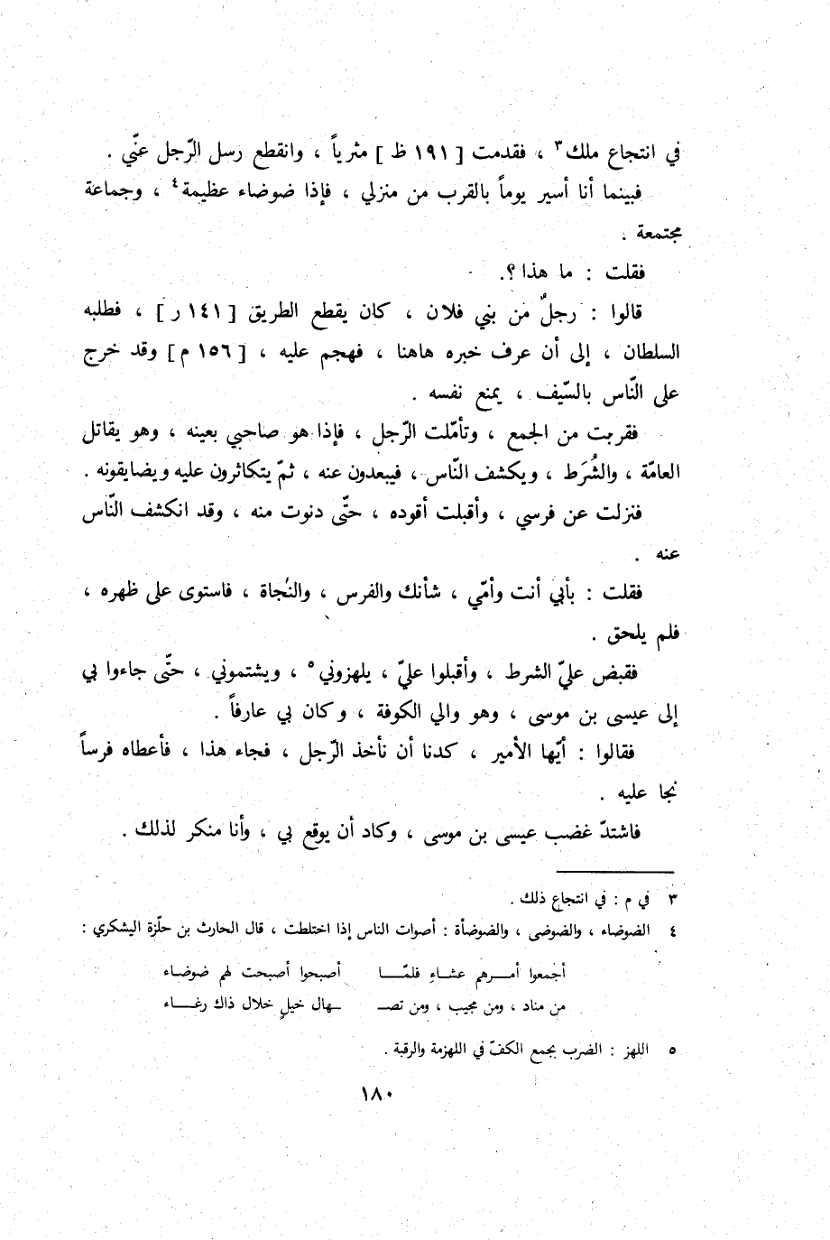فقربت من الْجمع، وتأملت الرجل، فَإِذا هُوَ صَاحِبي بِعَيْنِه، وَهُوَ يُقَاتل الْعَامَّة، وَالشّرط، ويكشف النَّاس، فيبعدون عَنهُ، ثمَّ يتكاثرون عَلَيْهِ ويضايقونه.