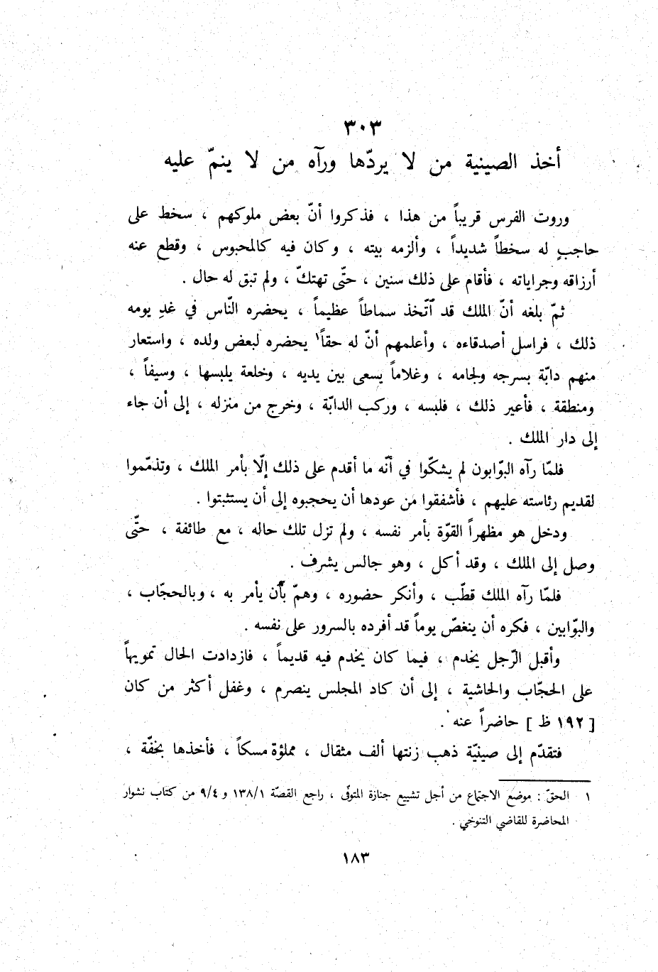 وروت الْفرس قَرِيبا من هَذَا، فَذكرُوا أَن بعض مُلُوكهمْ، سخط على حَاجِب لَهُ سخطا شَدِيدا، وألزمه بَيته، وَكَانَ فِيهِ كالمحبوس، وَقطع عَنهُ أرزاقه وجراياته، فَأَقَامَ على ذَلِك سِنِين، حَتَّى تهتك، وَلم تبْق لَهُ حَال.
