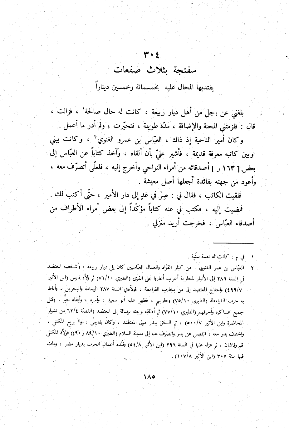 وَكَانَ أَمِير النَّاحِيَة، إِذْ ذَاك، الْعَبَّاس بن عَمْرو الغنوي، وَكَانَت بيني وَبَين كَاتبه معرفَة قديمَة، فأشير عَليّ بِأَن أَلْقَاهُ، وآخذ كتابا عَن الْعَبَّاس إِلَى بعض أصدقائه من أُمَرَاء النواحي وَأخرج إِلَيْهِ، فلعلي أتصرف مَعَه، وأعود من جِهَته بفائدة أجعلها أصل معيشة.