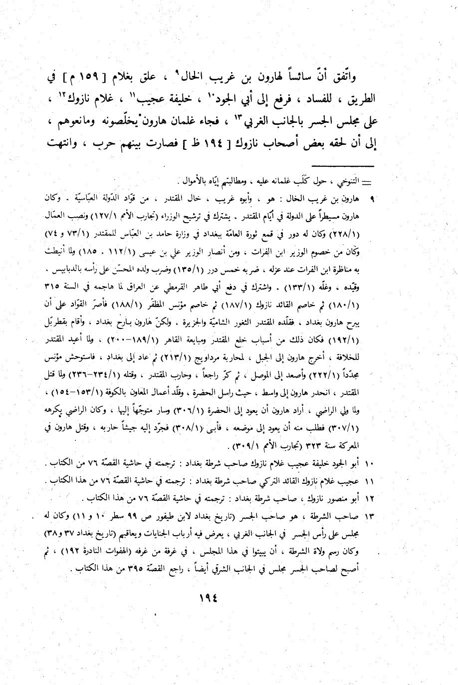 وَاتفقَ أَن سائسا لهارون بن غَرِيب الْخَال، علق بِغُلَام فِي الطَّرِيق، للْفَسَاد، فَرفع إِلَى أبي الْجُود، خَليفَة عَجِيب، غُلَام نازوك، على مجْلِس الجسر بالجانب الغربي، فجَاء غلْمَان هَارُون يخلصونه ومانعوهم، إِلَى أَن لحقه بعض أَصْحَاب نازوك، فَصَارَت بَينهم حَرْب، وانتهت