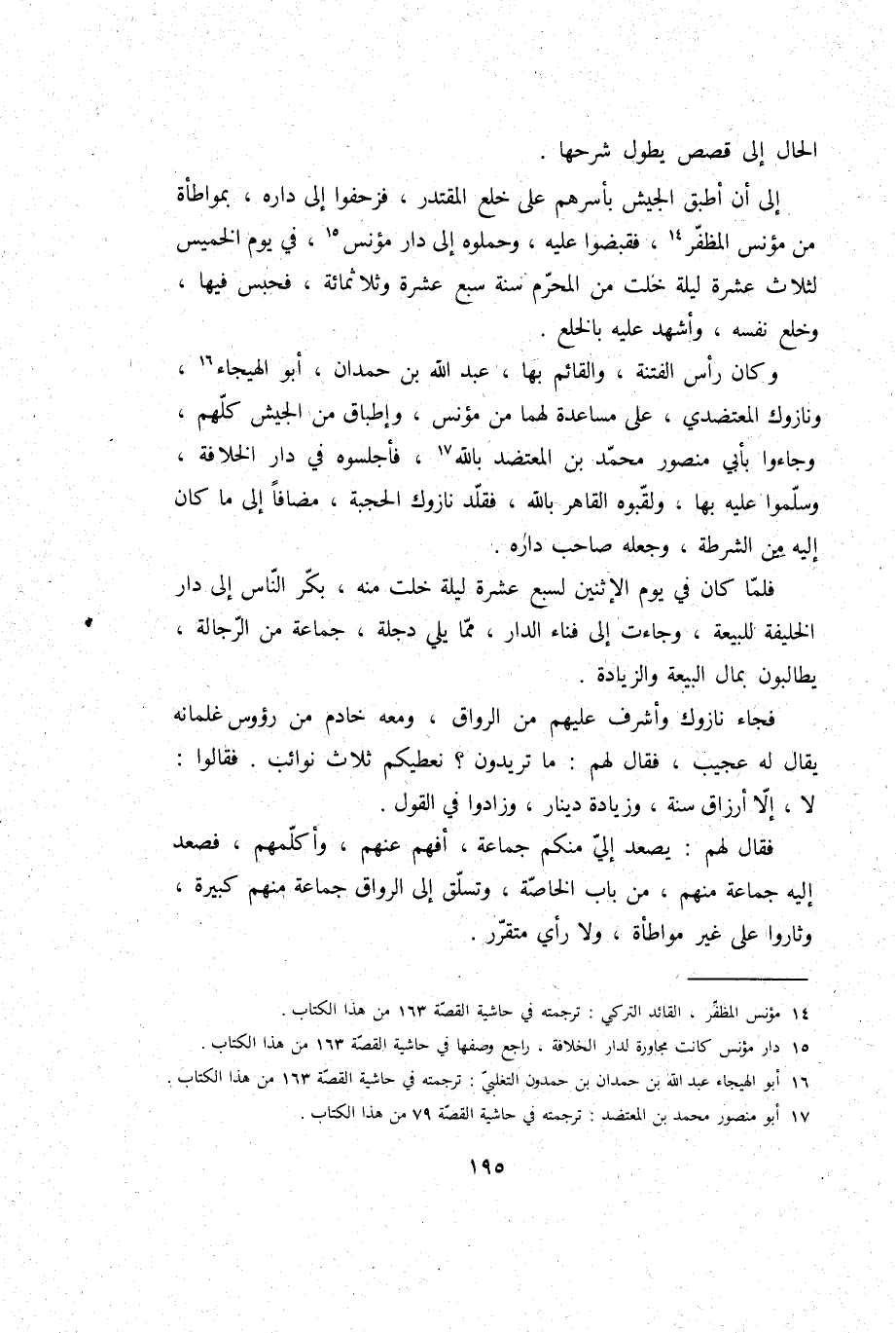 وَكَانَ رَأس الْفِتْنَة، والقائم بهَا عبد الله بن حمدَان أَبُو الهيجاء، ونازوك المعتضدي، على مساعدة لَهما من مؤنس، وإطباق من الْجَيْش كلهم، وَجَاءُوا بِأبي مَنْصُور مُحَمَّد بن المعتضد بِاللَّه، فَأَجْلَسُوهُ فِي دَار الْخلَافَة، وسلموا عَلَيْهِ بهَا، ولقبوه القاهر بِاللَّه، فقلد نازوك الحجبة، مُضَافا إِلَى مَا كَانَ إِلَيْهِ من الشرطة، وَجعله صَاحب دَاره.