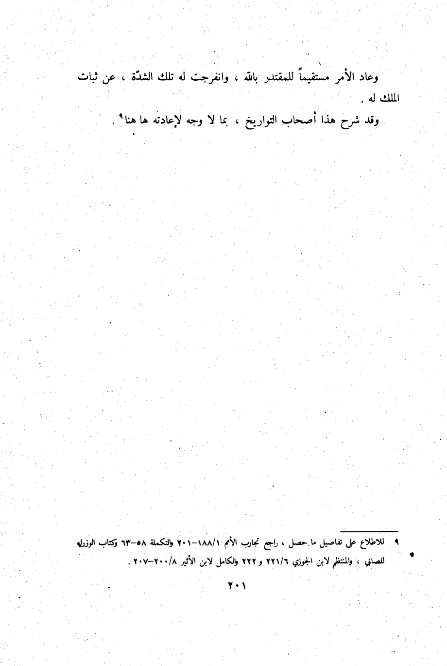 وَعَاد الْأَمر مُسْتَقِيمًا للمقتدر بِاللَّه، وانفرجت لَهُ تِلْكَ الشدَّة، عَن ثبات الْملك لَهُ.