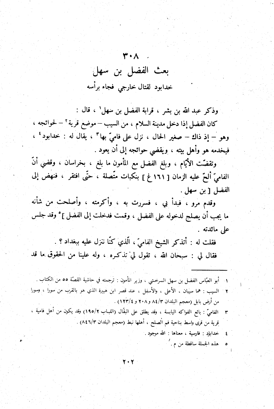 وَذكر عبد الله بن بشر، قرَابَة الْفضل بن سهل، قَالَ: كَانَ الْفضل إِذا دخل مَدِينَة السَّلَام، من السيب، مَوضِع قَرْيَة، لحوائجه، وَهُوَ، إِذْ ذَاك، صَغِير الْحَال، نزل على فامي بهَا، يُقَال لَهُ: خدابود، فيخدمه هُوَ وَأهل بَيته، وَيَقْضِي حَوَائِجه إِلَى أَن يعود.