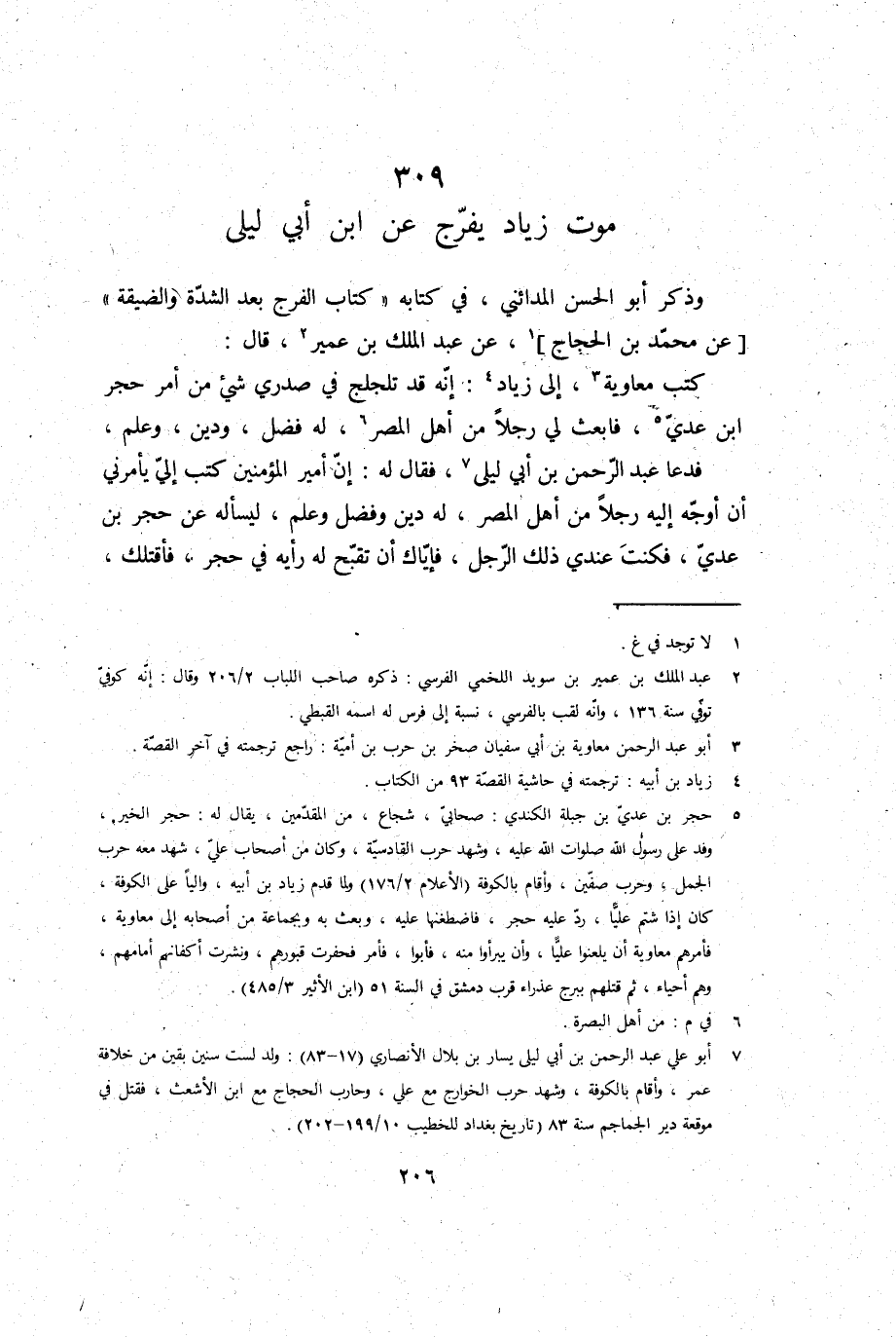وَذكر أَبُو الْحسن الْمَدَائِنِي، فِي كِتَابه: كتاب (الْفرج بعد الشدَّة والضيقة) ، عَن مُحَمَّد بن الْحجَّاج، عَن عبد الْملك بن عُمَيْر، قَالَ: كتب مُعَاوِيَة، إِلَى زِيَاد: إِنَّه قد تلجلج فِي صَدْرِي شَيْء من أَمر حُجْر بن عدي، فَابْعَثْ لي رجلا من أهل الْمصر، لَهُ فضل وَدين وَعلم، فَدَعَا عبد الرَّحْمَن بن أبي ليلى، فَقَالَ لَهُ: إِن أَمِير الْمُؤمنِينَ كتب إِلَيّ يَأْمُرنِي أَن أوجه إِلَيْهِ رجلا من أهل الْمصر، لَهُ دين وَفضل وَعلم؛ ليسأله عَن حجر بن عدي، فكنتَ عِنْدِي ذَلِك الرجل، فإياك أَن تقبح لَهُ رَأْيه فِي حجر، فأقتلك،