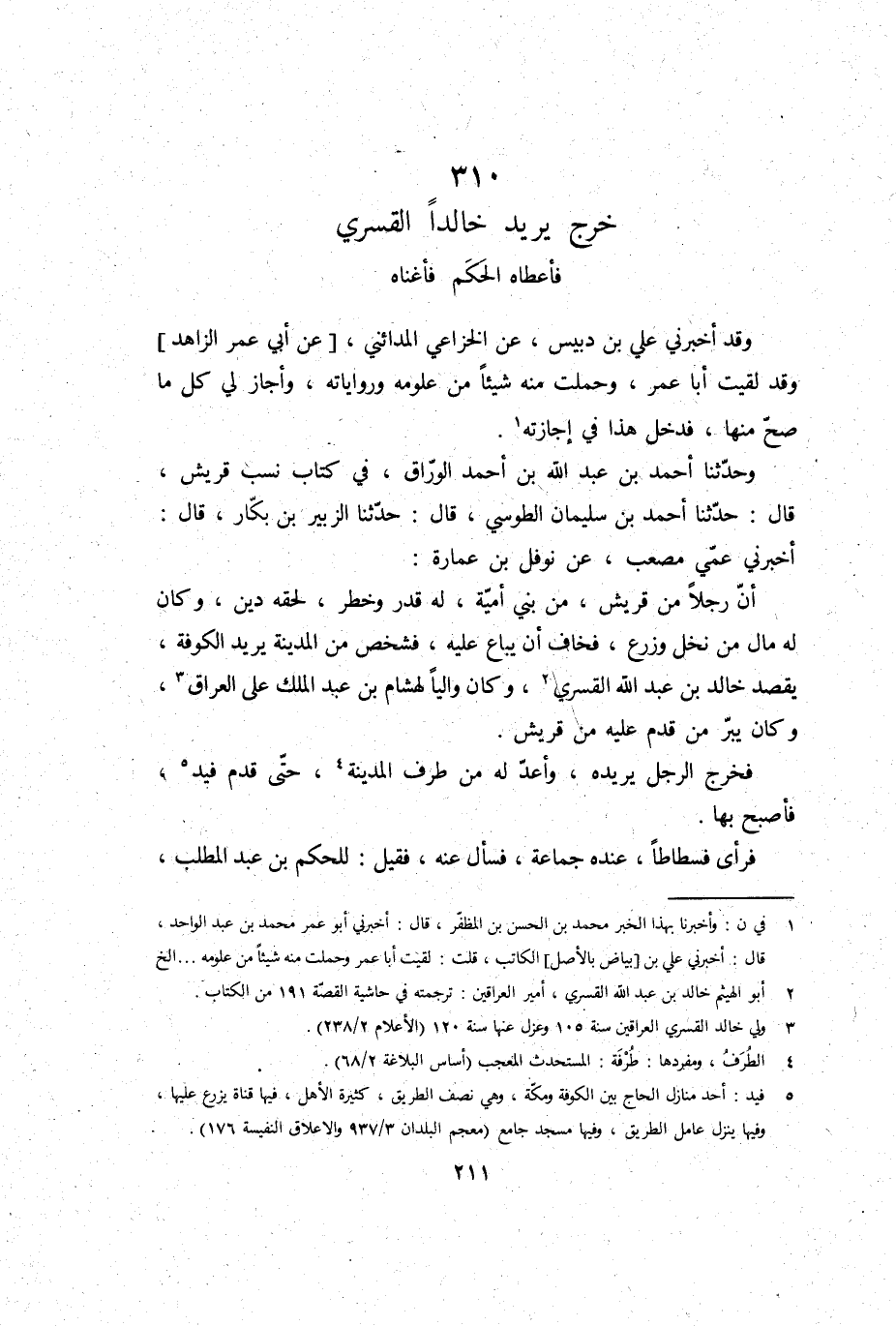 وَحدثنَا أَحْمد بن عبد الله بن أَحْمد الْوراق، فِي كتاب (نسب قُرَيْش) ، قَالَ: حَدثنَا أَحْمد بن سُلَيْمَان الطوسي، قَالَ: حَدثنَا الزبير بن بكار، قَالَ: أَخْبرنِي عمي مُصعب، عَن نَوْفَل بن عمَارَة: أَن رجلا من قُرَيْش، من بني أُمِّي، لَهُ قدر وخطر، لحقه دين، وَكَانَ لَهُ مَال من نخل وَزرع، فخاف أَن يُبَاع عَلَيْهِ، فشخص من الْمَدِينَة يُرِيد الْكُوفَة، يقْصد خَالِد بن عبد الله الْقَسرِي، وَكَانَ واليا لهشام عبد الْملك على الْعرَاق، وَكَانَ يبر من قدم عَلَيْهِ من قُرَيْش.