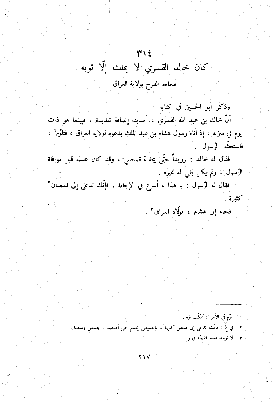 وَذكر أَبُو الْحُسَيْن فِي كِتَابه: أَن خَالِد بن عبد الله الْقَسرِي، أَصَابَته إضاقة شَدِيدَة، فَبَيْنَمَا هُوَ ذَات يَوْم من منزله، إِذْ أَتَاهُ رَسُول هِشَام بن عبد الْملك يَدعُوهُ لولاية الْعرَاق، فَتلوم، فاستحثه الرَّسُول.