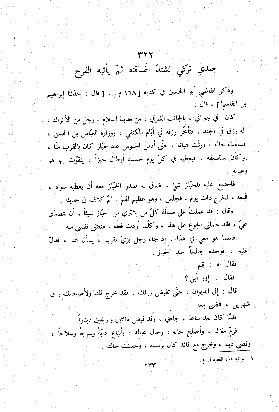 وَذكر القَاضِي أَبُو الْحُسَيْن فِي كِتَابه، قَالَ: حَدثنَا إِبْرَاهِيم بن الْقَاسِم، قَالَ: كَانَ فِي جيراني، بالجانب الشَّرْقِي من مَدِينَة السَّلَام، رجل من الأتراك، لَهُ رزق فِي الْجند، فَتَأَخر رزقه فِي أَيَّام المكتفي، ووزارة الْعَبَّاس بن الْحسن، فَسَاءَتْ حَاله، ورثت هَيئته، حَتَّى أدمن الْجُلُوس عِنْد خباز كَانَ بِالْقربِ منا، وَكَانَ يستسعفه، فيعطيه فِي كل يَوْم خَمْسَة أَرْطَال خبْزًا، يتقوت بهَا هُوَ وَعِيَاله.